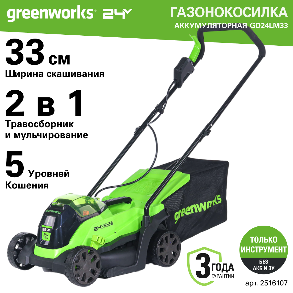 Газонокосилка аккумуляторная GREENWORKS GD24LM33, 24V 33 см, бесщеточная, без АКБ и ЗУ интересное: