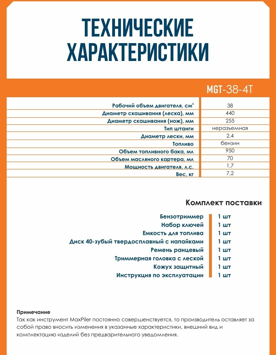 Ниже Вы можете прочитать отзывы на Бензотриммер MGT-38-4T (1,7л.с,38 см³, 4-такт, диск 40-зуб, ранцевый ремень), ознакомится с подробными характеристиками, посмотреть интересные обзоры и фотографии на Бензотриммер MGT-38-4T (1,7л.с,38 см³, 4-такт, диск 40-зуб, ранцевый ремень).