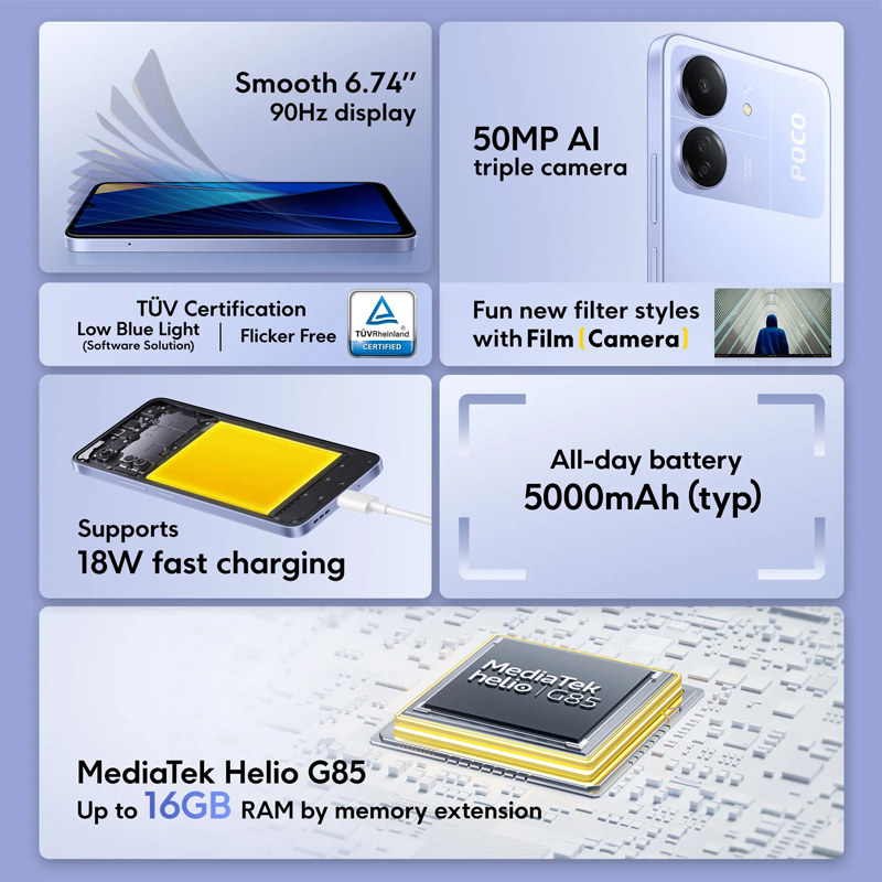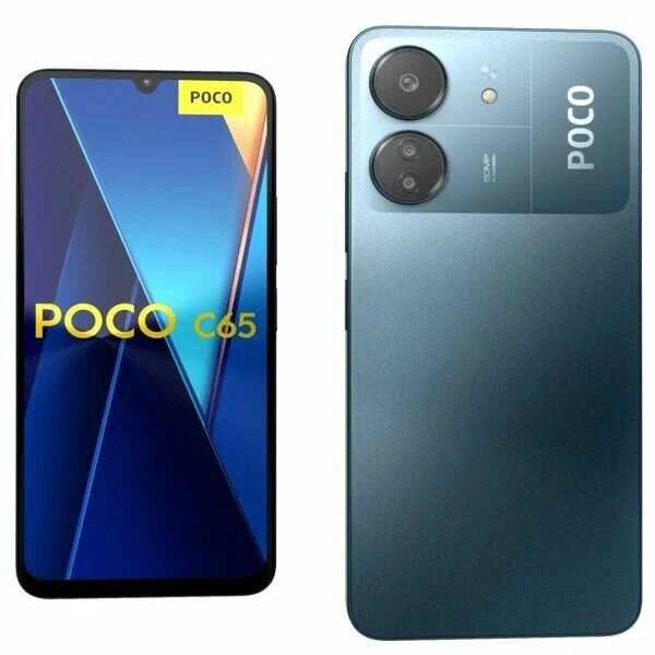 POCO C65 Blue 17,12 см (6.74") 20:9 1612 x 720, 2x2.0 ГГц Cortex-A75 + 6x1.8 ГГц Cortex-A55, 8 Core, 6 GB, 128 GB, 50 МП +2 МП + QVGA/8Mpix, 2 Sim, 2G, 3G, LTE, BT v5.0, WiFi 802.11 a/b/g/n/ac/ax, A-GPS, GALILEO, BEIDOU, GLONASS, GPS, Tupe-C, 5000mAh, And