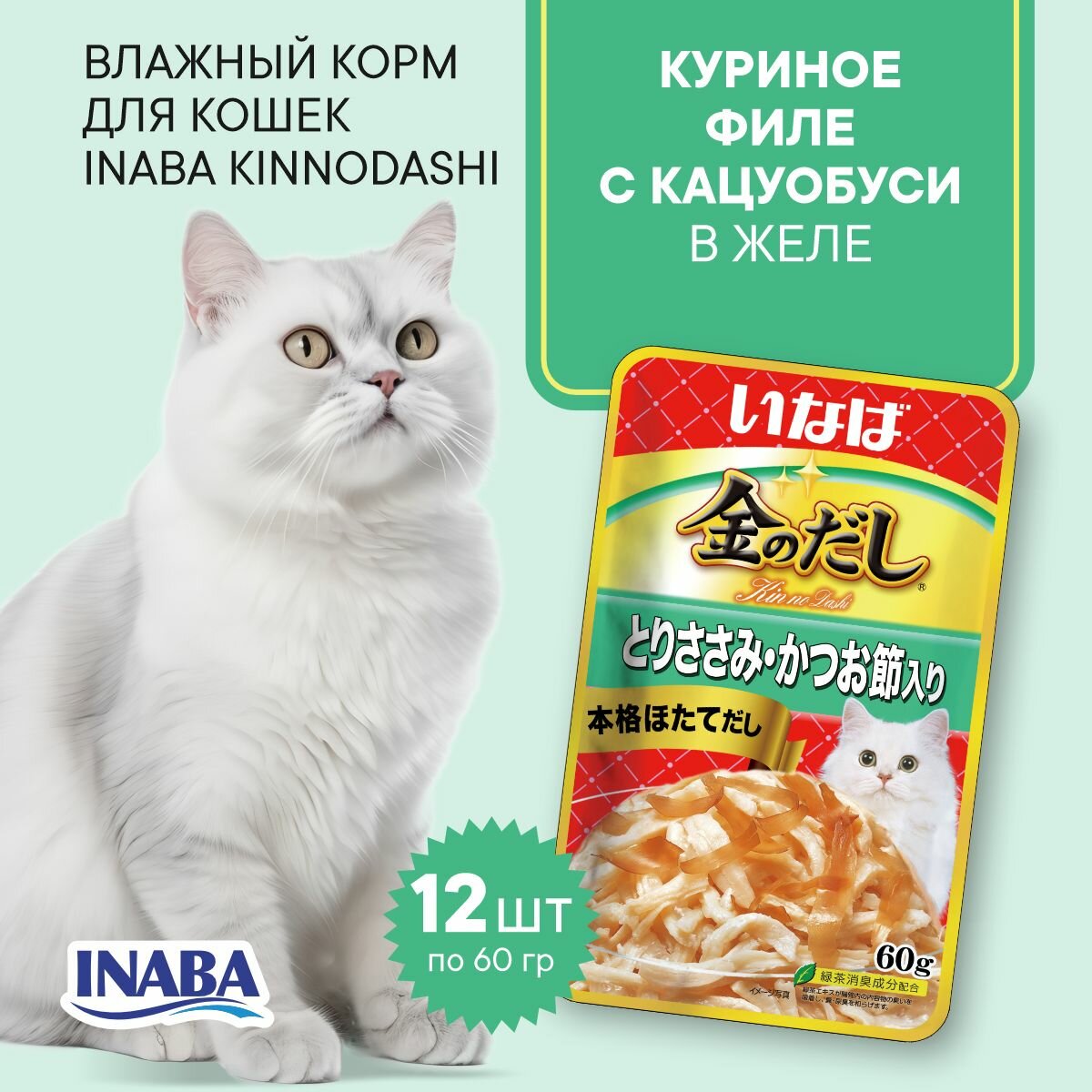 Купить Корм для кошек влажный INABA KINNODASHI Куриное филе и кацуобуси в желе, пауч 60г, 12 шт.