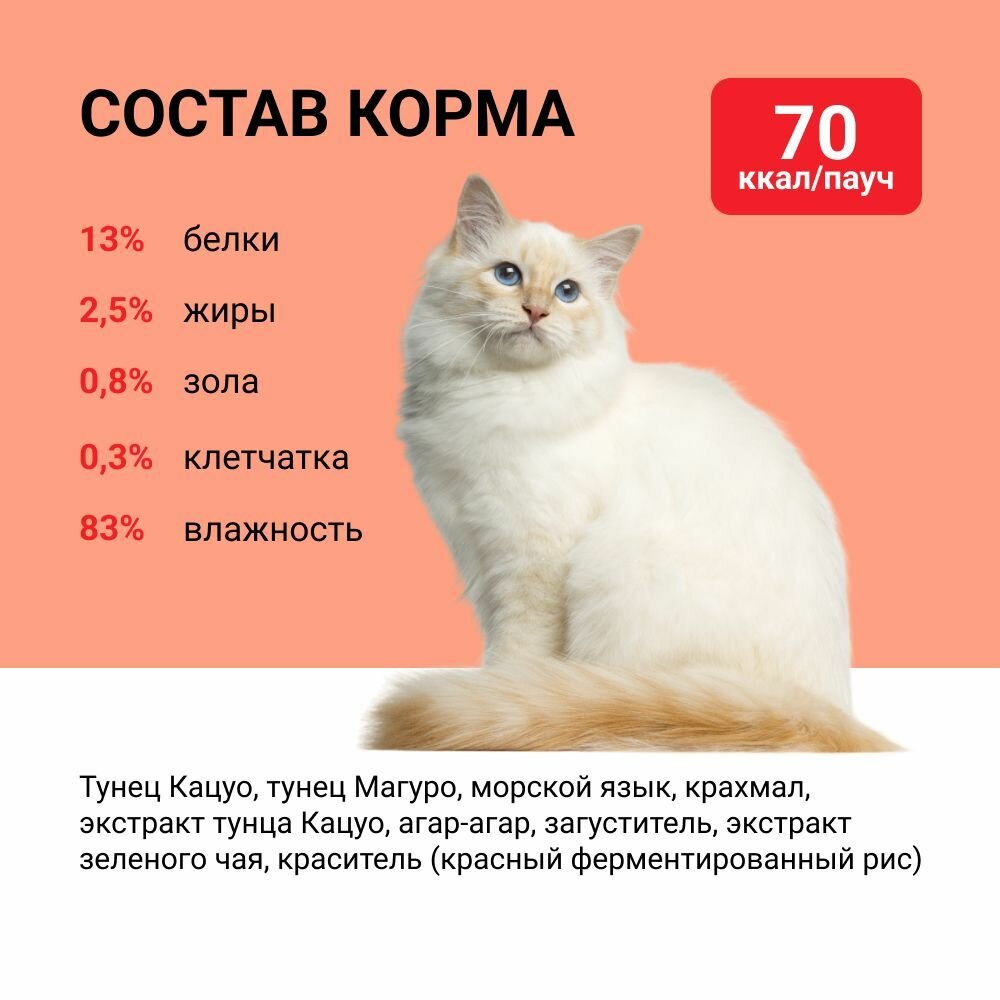 | Дозировка | Пауч рассчитан на 1 кормление взрослой кошки среднего размера. Рекомендованная норма кормления до 2 упаковок в день, как дополнение к полнорационному корму |