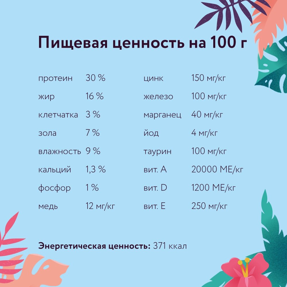 | Минеральные вещества | Цинк 150 мг/кг, железо 100 мг/кг, марганец 40 мг/кг, йод 4 мг/кг, таурин 100 мг/кг |