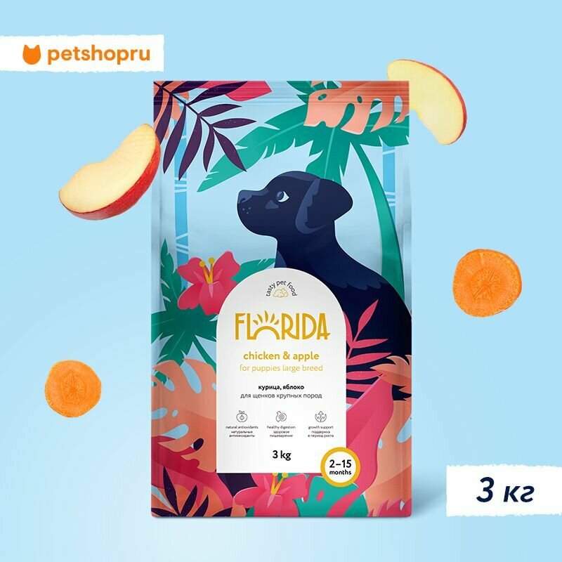 Ниже Вы можете прочитать отзывы на Florida сухой корм для щенков крупных пород с курицей и яблоком - 3 кг, ознакомится с подробными характеристиками, посмотреть интересные обзоры и фотографии на Florida сухой корм для щенков крупных пород с курицей и яблоком - 3 кг.