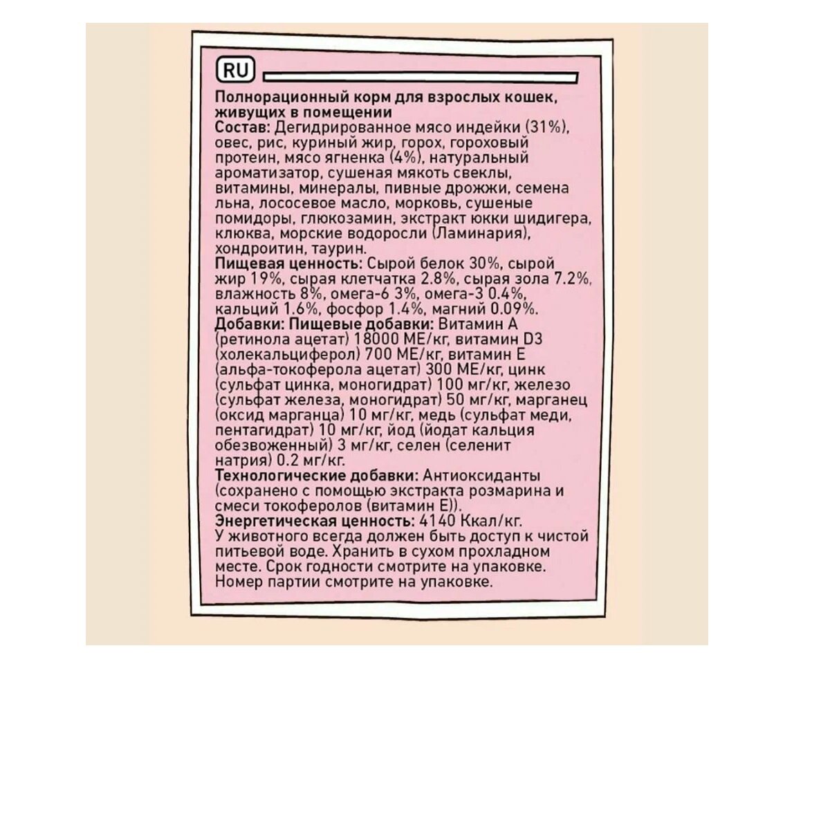 | Пищевая ценность | Сырой белок 30%, сырой жир 19%, сырая клетчатка 2.8%, сырая зола 7.2%, влажность 8%, омега-6 3%, омега-3 0.4%, кальций 1.6%, фосфор 1.4%, магний 0.09% |
