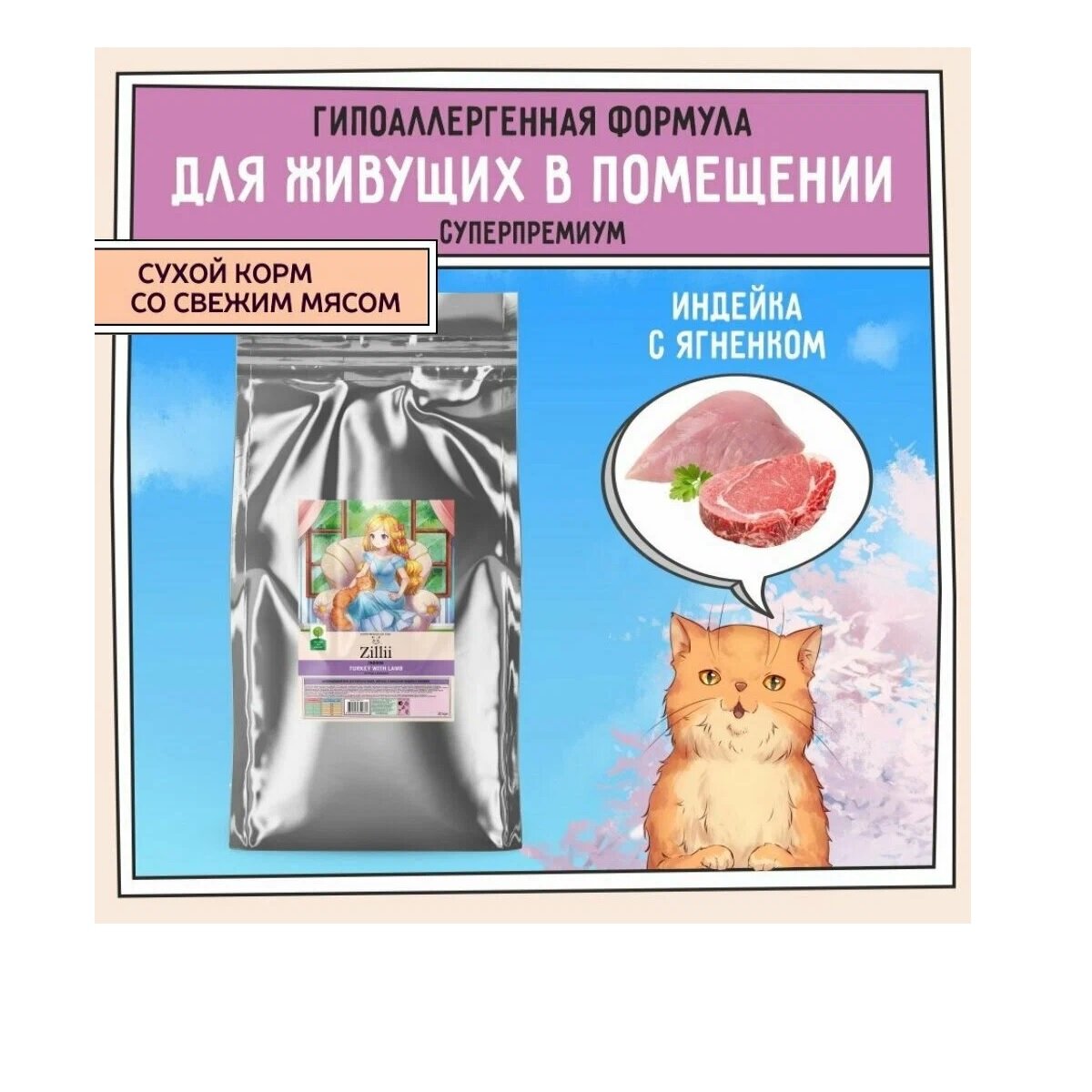 Корм для кошек сухой гипоаллергенный 400 г, для живущих в помещении ZILLII (Зилли) Indoor, Индейка с Ягнёнком