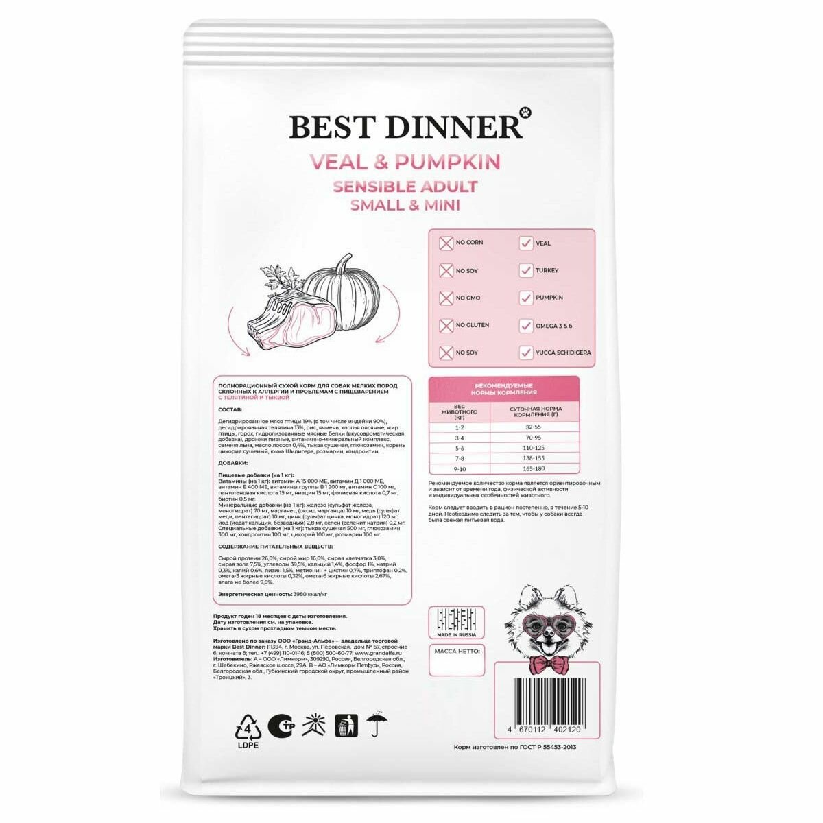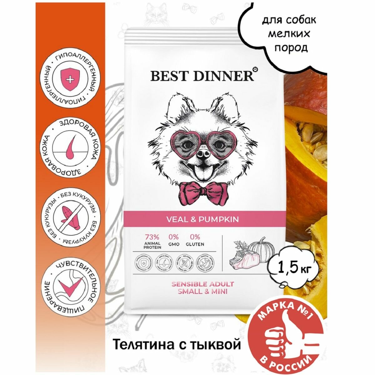 BEST DINNER 1,5кг корм сухой для собак мелких пород склонных к аллергии и проблемам с пищеварением с Телятиной и тыквой