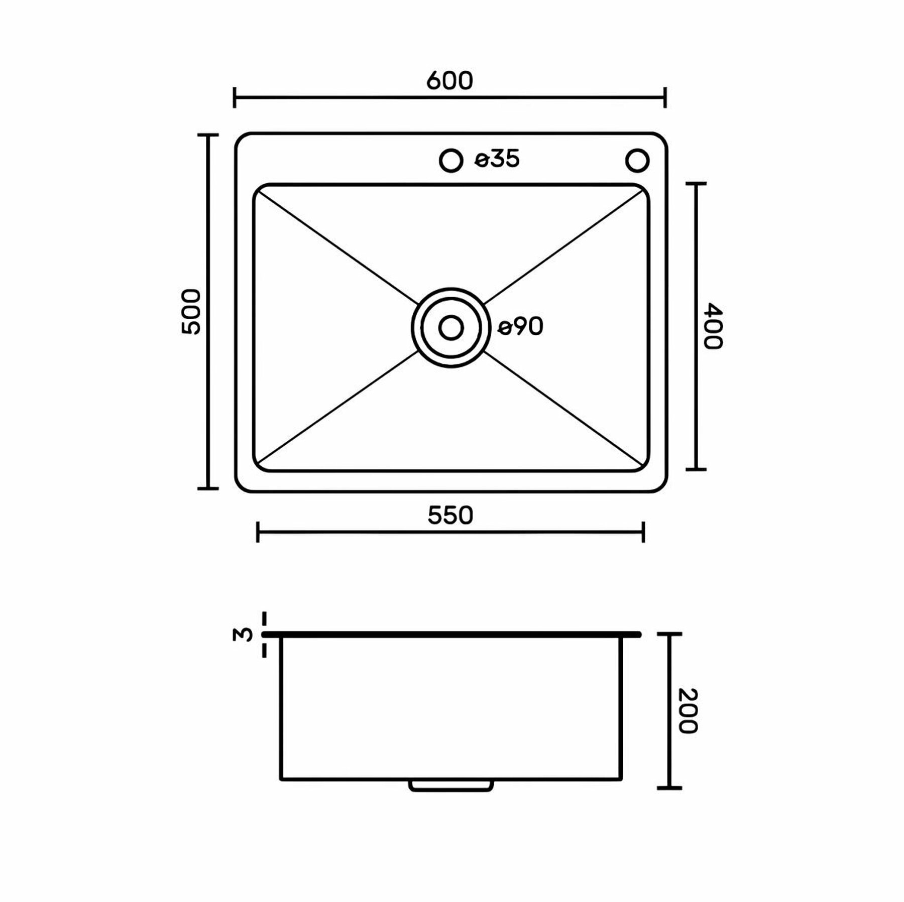 Мойка врезная 60х50 см, графит, дизайн толщина 3,0 х 1 мм,