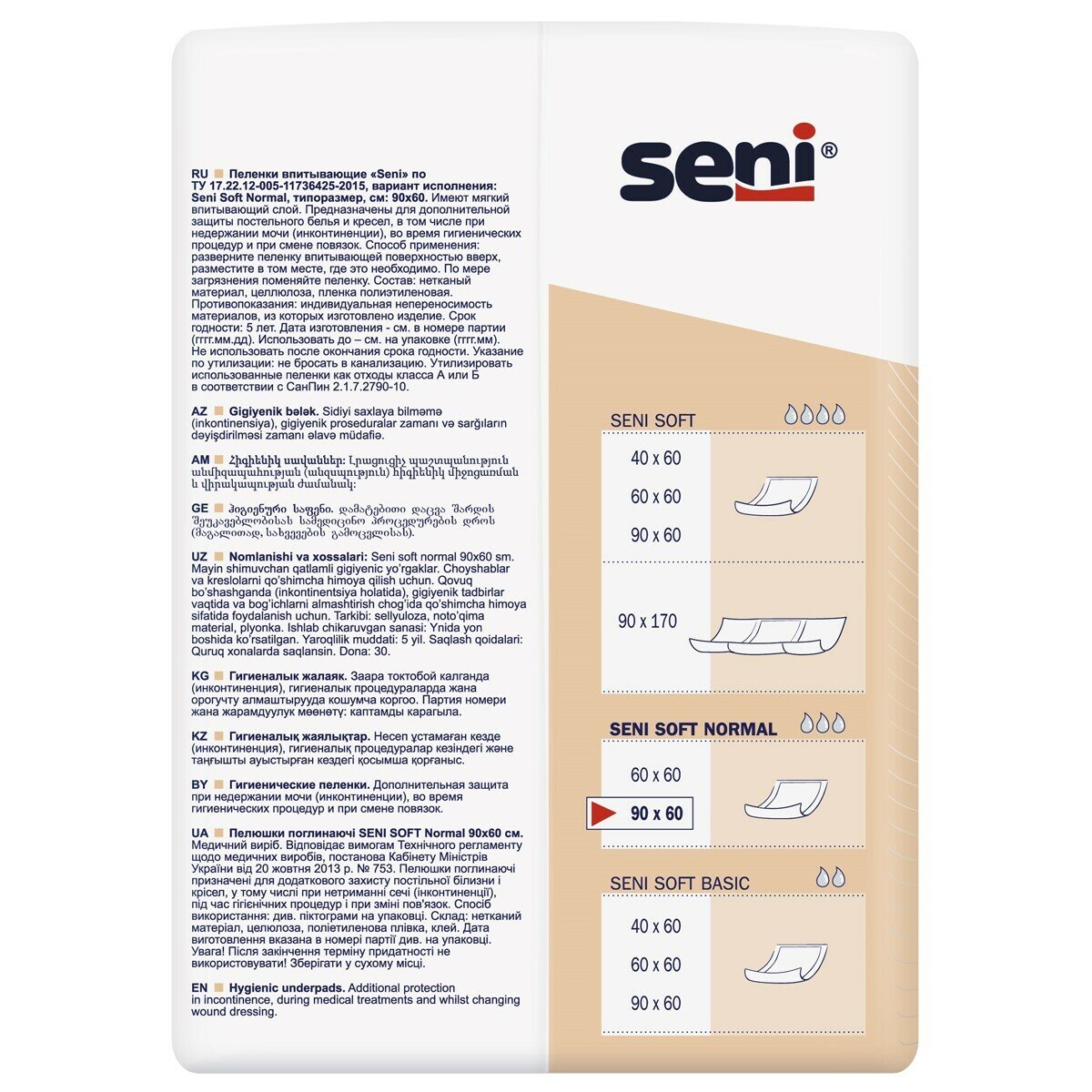 Пеленки 60х90 см, SENI SOFT NORMAL, комплект 30 шт., впитывающие, одноразовые, SE-091-SN30-J03
