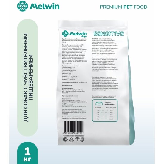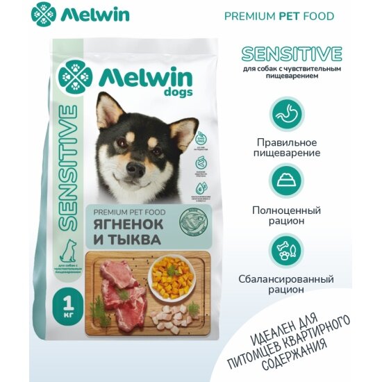 Купить Сухой корм Melwin 1кг для взрослых собак с чувствительным пищеварением любых пород, ягненок и тыква