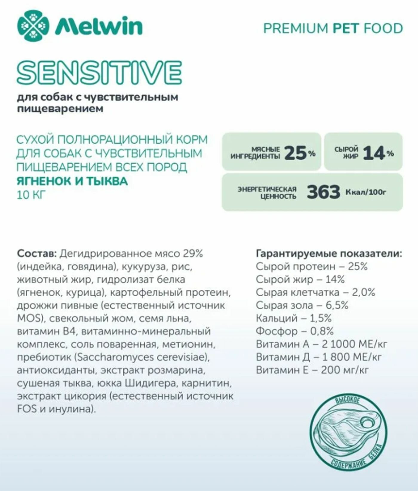 Корм сухой Melwin для собак с чувствительным пищеварением, с ягненком и тыквой, 10 кг