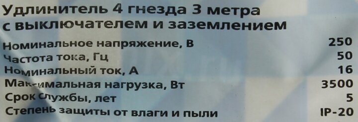 | Минусы: | Купил год назад, лежал в упаковке. При первом использовании, включая в розетку, понял, что вилка не держится, выпадает из розетки. Пошел в другую включил и та же проблема. Оказалось, что один штырь в вилке короче другого на 2-3 мм и он не закруглен как другой. В итоге имеем: две сломанные розетки (квадратный штырь просто прогнул крепление в розетках стоимостью 500 р. каждая.) и не плохой удлинитель. |