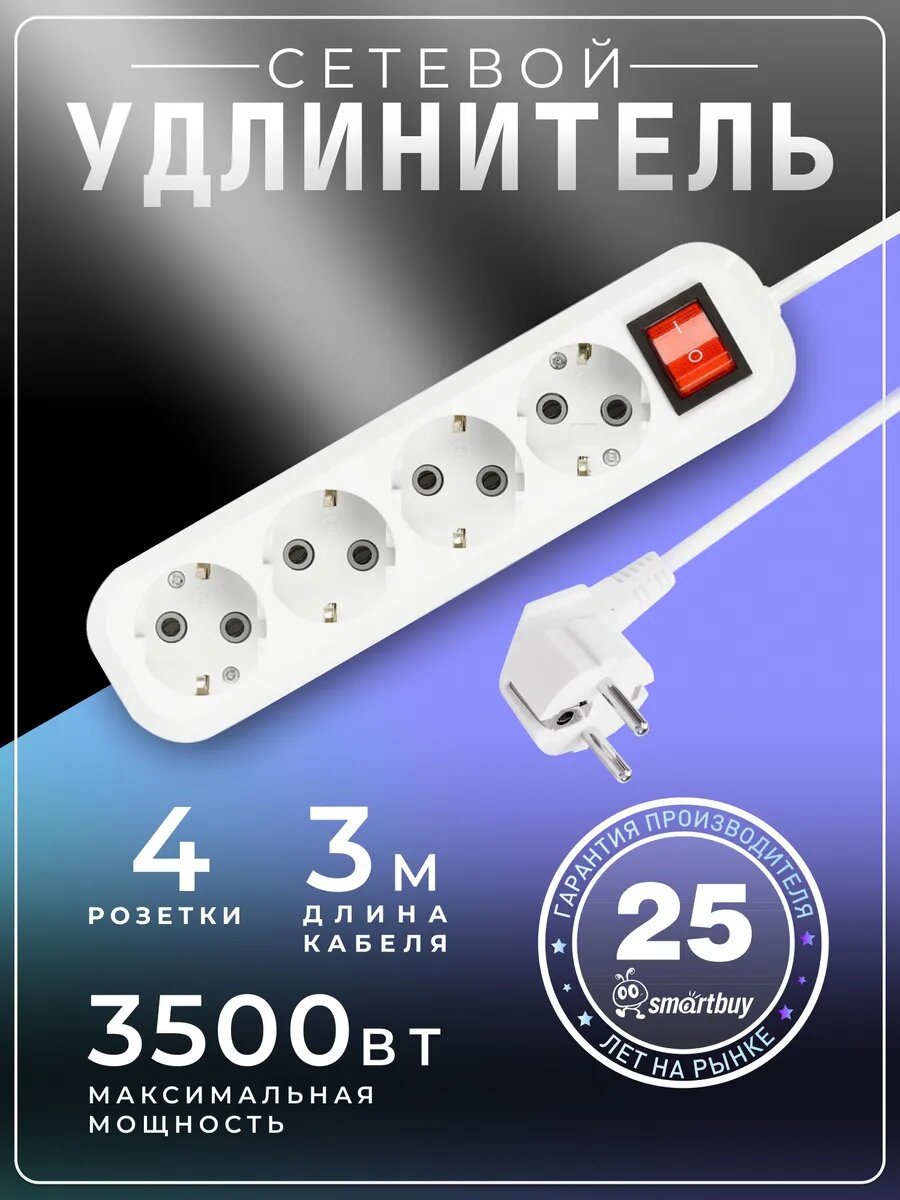Удлинитель Smartbuy, 4 гнезда 3 метра 16А/3,5кВт с выкл. и заземлением ПВС 3х1,0 (SBE-16-4-03-ZS)/35