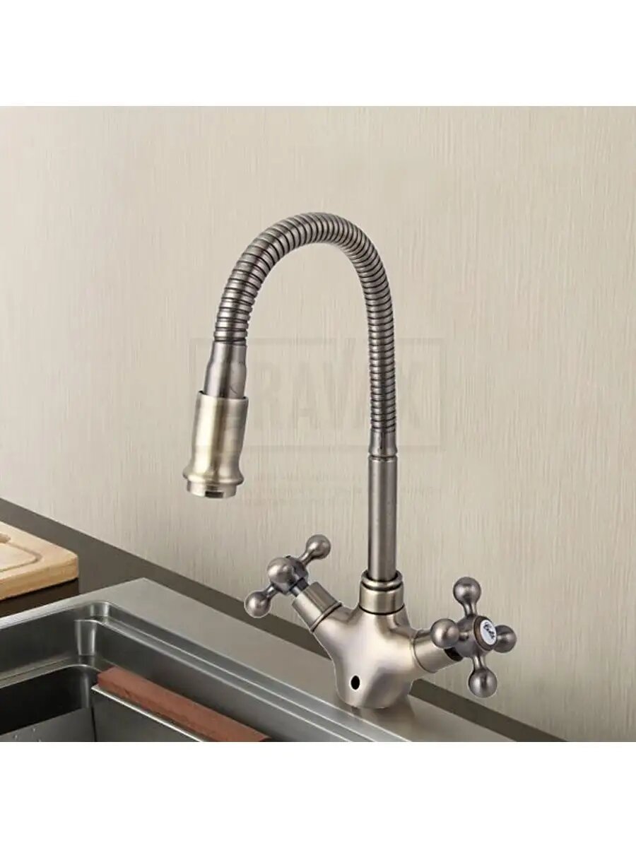 Этот оказался самым подходящим. Форма позволяет гнуть и направлять в удобное положение ,с помощью этого достает в любое место в двух отсеках .При этом выполнен в стиле ретро,что удачно вписалось в общий вид моей кухни. Использую месяц,но детям он так понравился ,что они его гнут и выкручивают в разные стороны при каждом подходе к раковине ,кран не разболтался и все так же держит форму.Приятно удивила цена. |