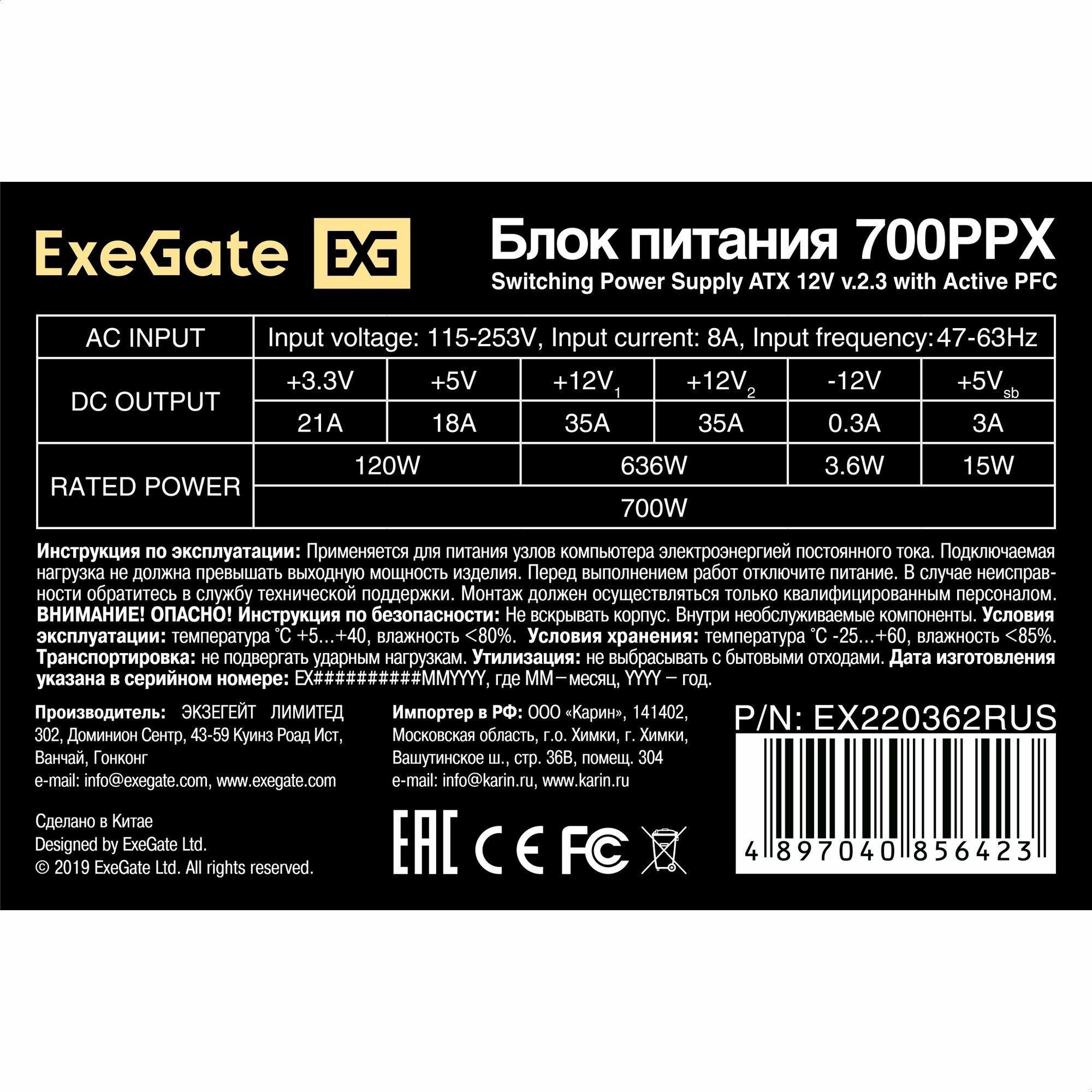 Блок питания Exegate ATX-700PPX, EX220362RUS .