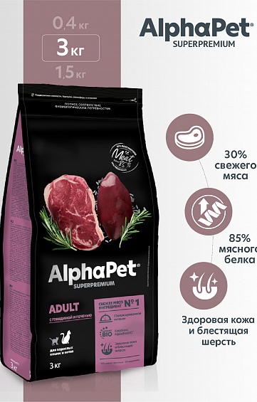 Сухой корм кошек AlphaPet Superpremium с говядиной и печенью, 3кг