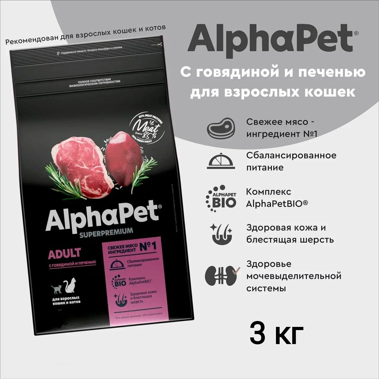Купить ALPHAPET SUPERPREMIUM сухой корм для взрослых домашних кошек и котов с говядиной и печенью 3 кг