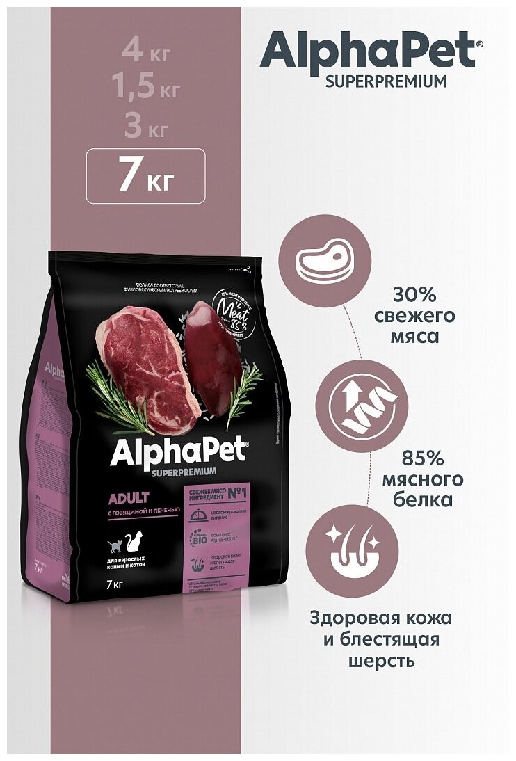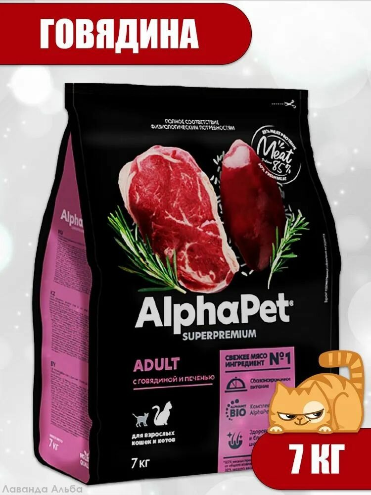 Сухой полнорационный корм AlphaPet Superpremium для взрослых кошек и котов, с говядиной и печенью, 7кг