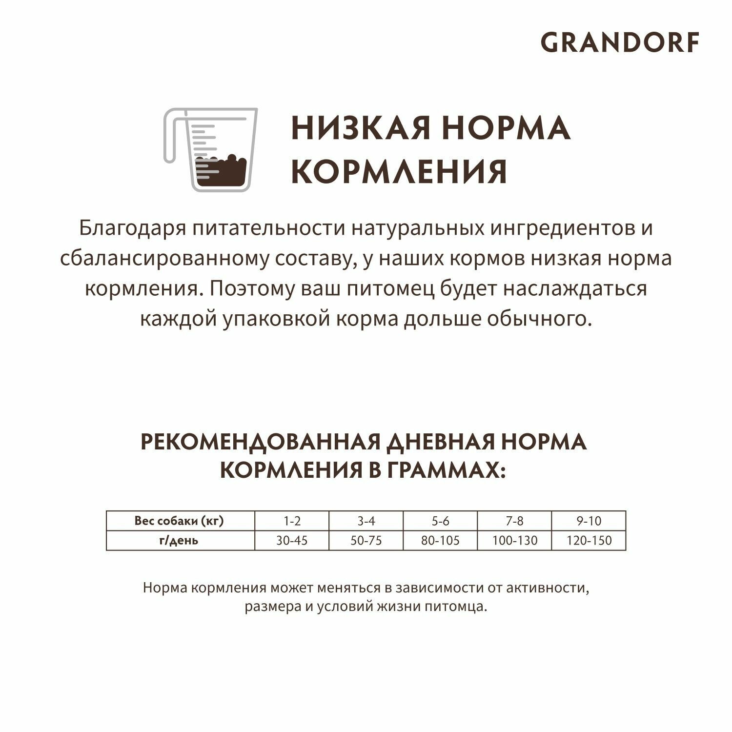 | Дозировка | Рекомендованная дневная норма кормления: 1кг - 30гр 2кг - 45гр 3кг - 50гр 4кг - 75г 5кг - 80г 6кг - 100г 7кг - 105г 8кг - 120г 9кг - 130г 10кг - 105г *Норма кормления может меняться в зависимости от активности, размера и условий жизни животного. Разделите дневную норму на несколько кормлений и всегда давайте свежую воду. |