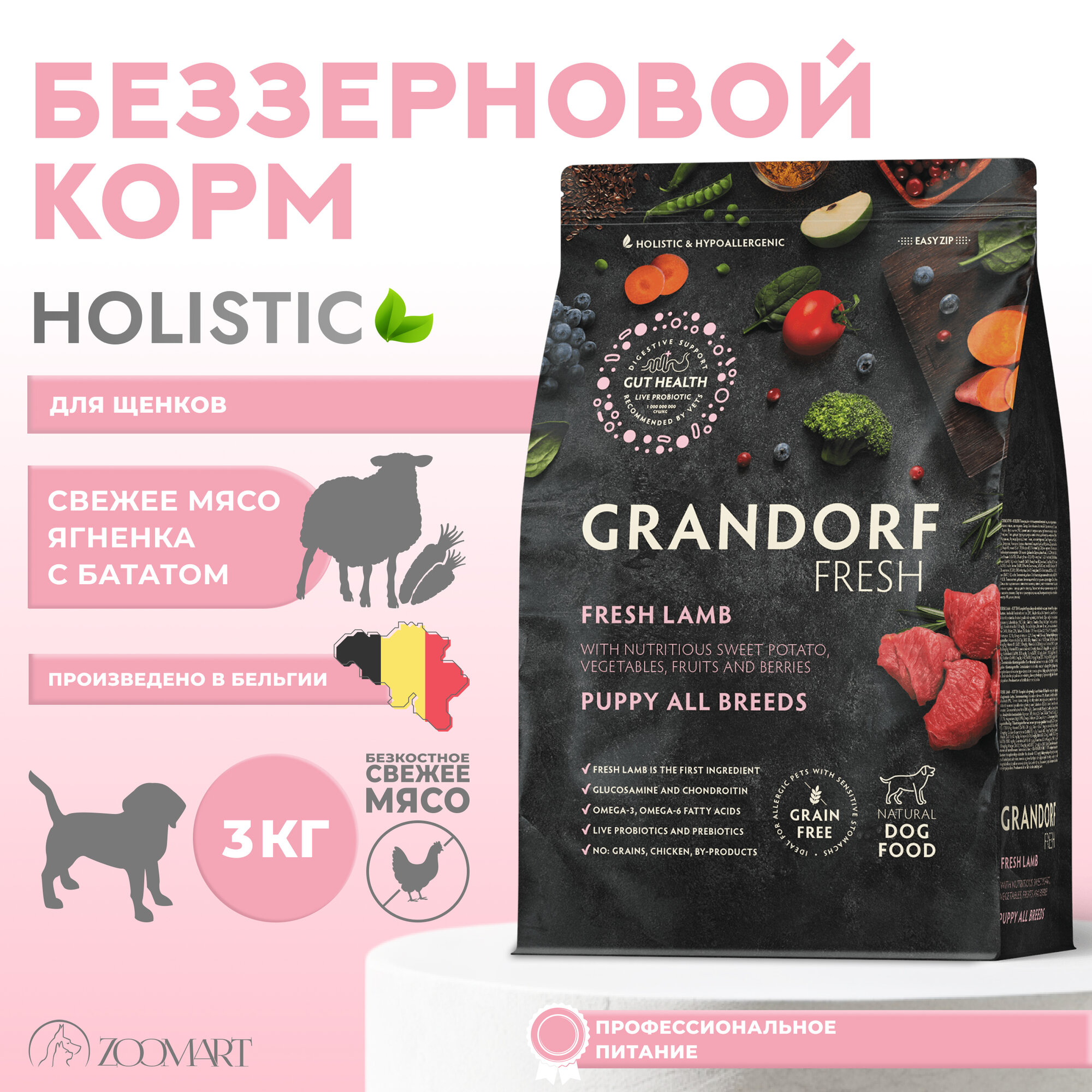 Корм сухой Grandorf Fresh , беззерновой с живыми пробиотиками, свежее мясо ягненка с бататом для щенков, 3 кг