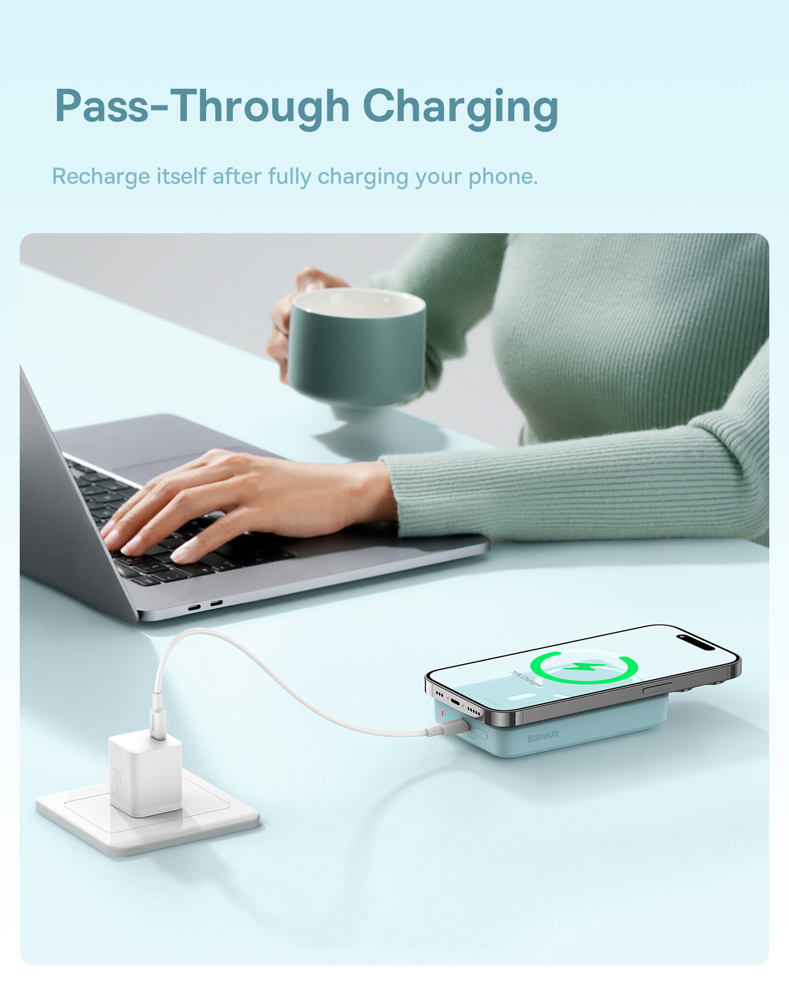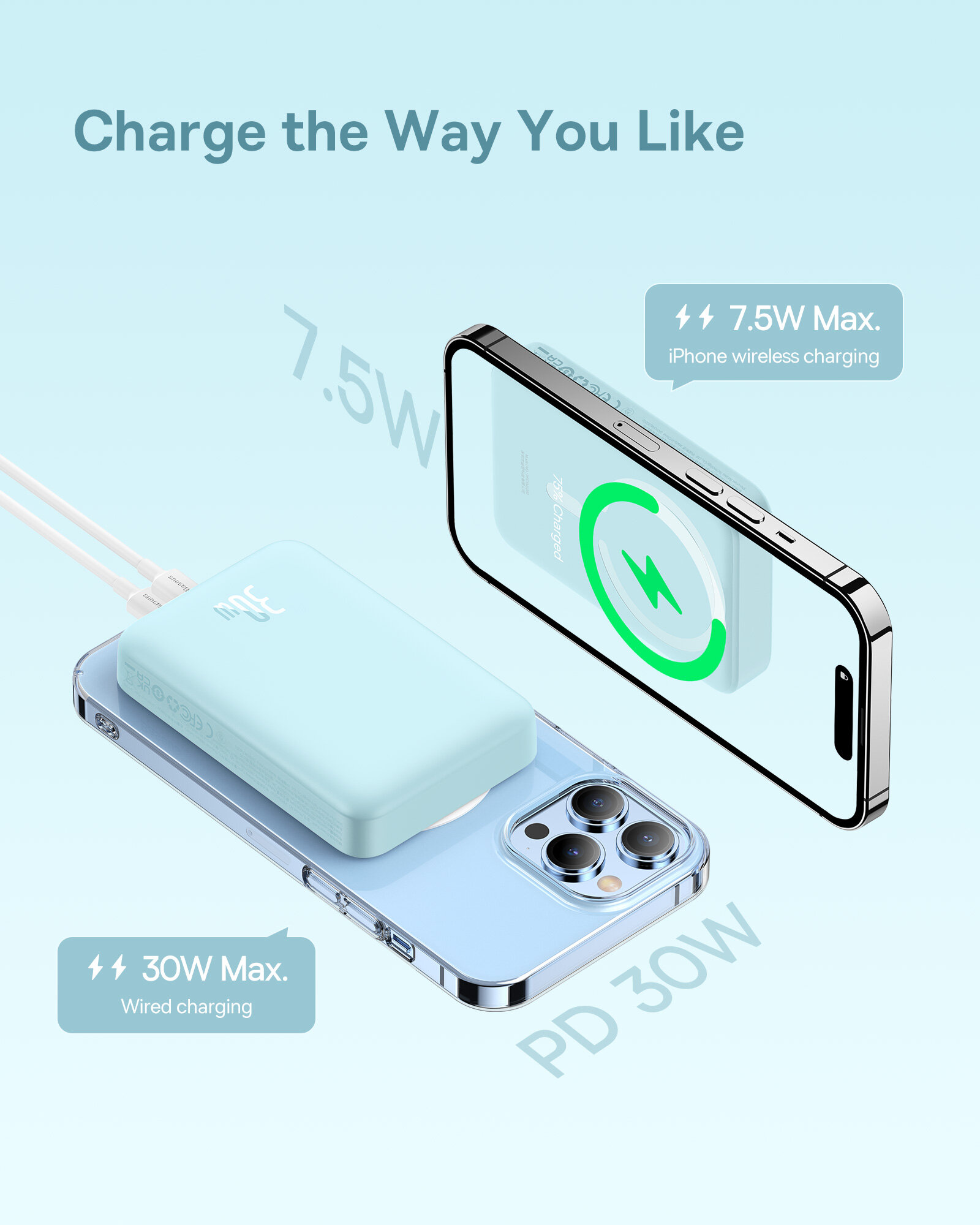 Внешний аккумулятор с беспроводной зарядкой Baseus Magnetic mini Wireless Fast Charge 10000mAh, 30W с кабелем Type-C to Type-C (PPCX110203)/Повербанк, голубой