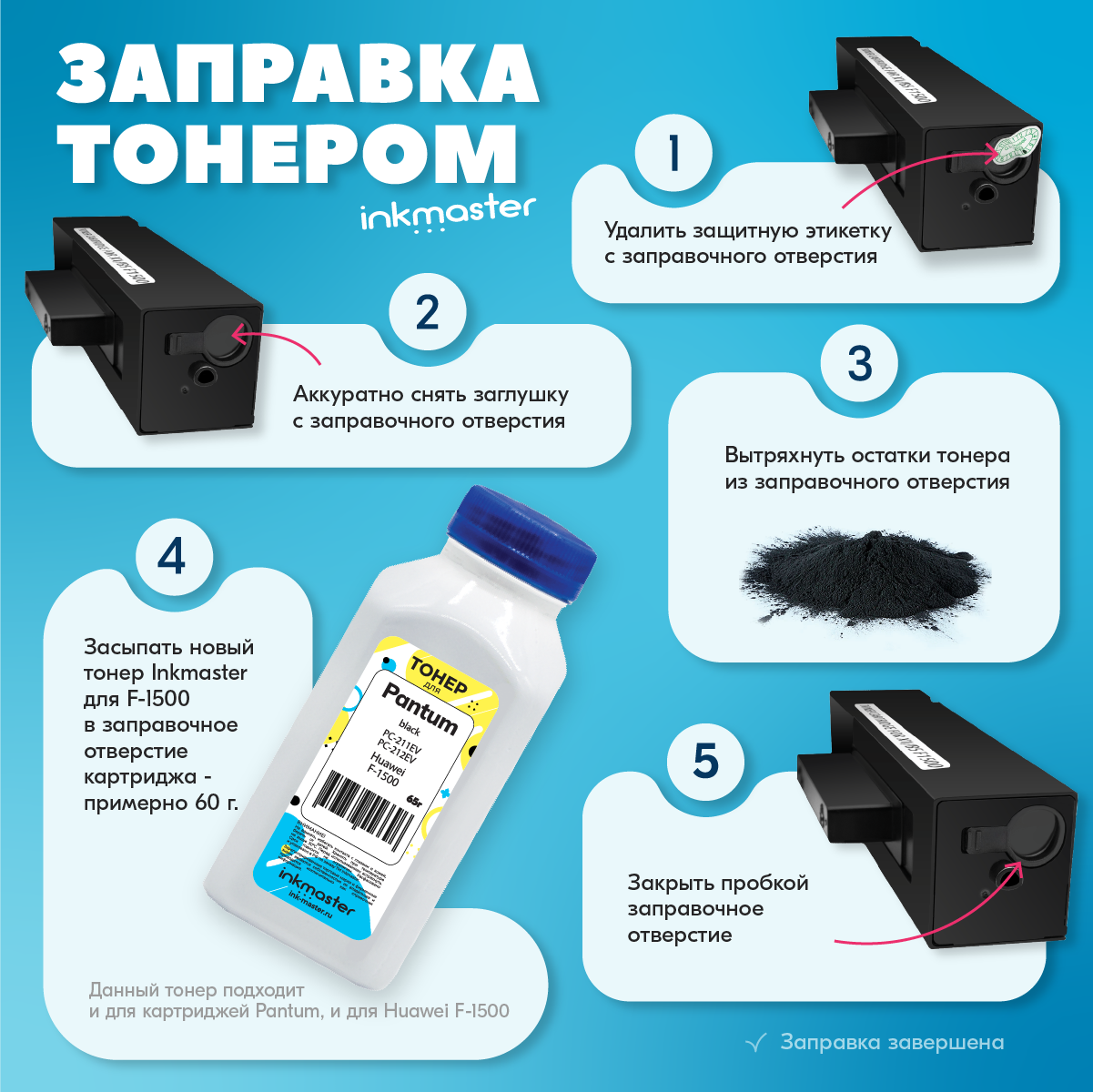 Тонер для картриджей Huawei F-1500 (CD81-F) принтеров PixLab X1, также для Pantum PC-211EV/PC-212EV (тонер/воронка) 65г