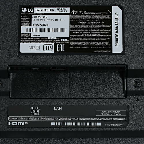 | Дополнительная информация | Голосовое управление. Смарт ТВ. Встроенный модуль Bluetooth: Да. Габаритные размеры (В*Ш*Г): 145.6*28.5 см. Серия: QNED816. Диагональ экрана: 164. Ultra HD: Да. Экран: 65"/3840x2160 Пикс. Частота обновления: 120. Технология HDMI ARC: Да. Цифровое шумоподавление: Да. Операционная система: WebOS. Звук: AI Sound Pro. Смартфон в качестве пульта ДУ: Да. Поддержка Wi-Fi: Да. Поддержка Smart TV: Да. Sleep-таймер: Да. Цифровой тюнер DVB: T/T2/C/S2. LAN разъем (RJ45): 1. Выход оптический (Toslink): 1. Разъем для модуля DVB CAM: 1. Настольная подставка: Да. Вес без подставки: 22.5. Гарантия предоставляется: продавцом. Воспроизведение с USB: Да |