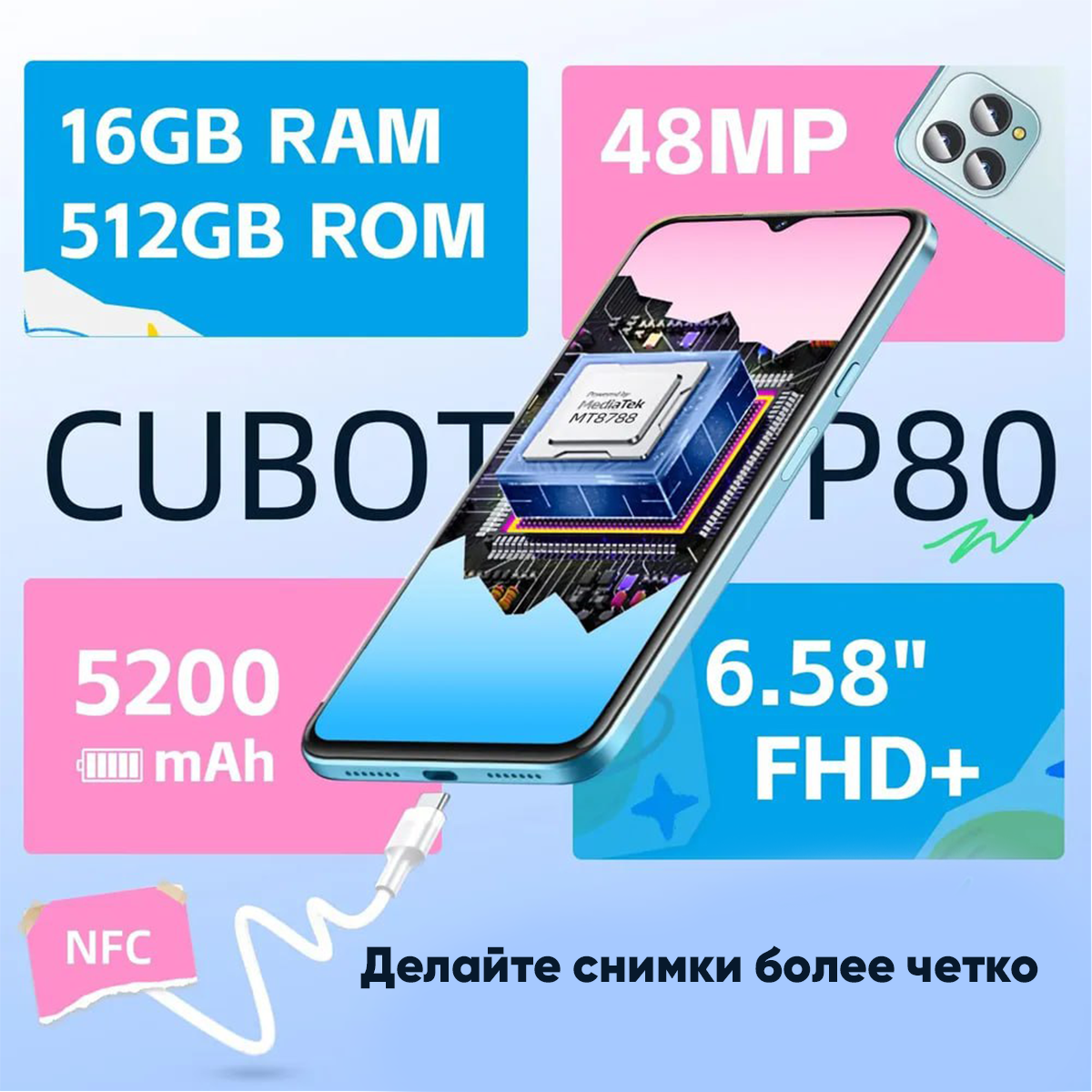 Смартфон Cubot P80 Глобальная версия, 16ГБ ОЗУ (8ГБ + 8ГБ расширение), 256ГБ ПЗУ ( + поддержка microSD до 1ТБ), русский язык 8/256 ГБ, синий