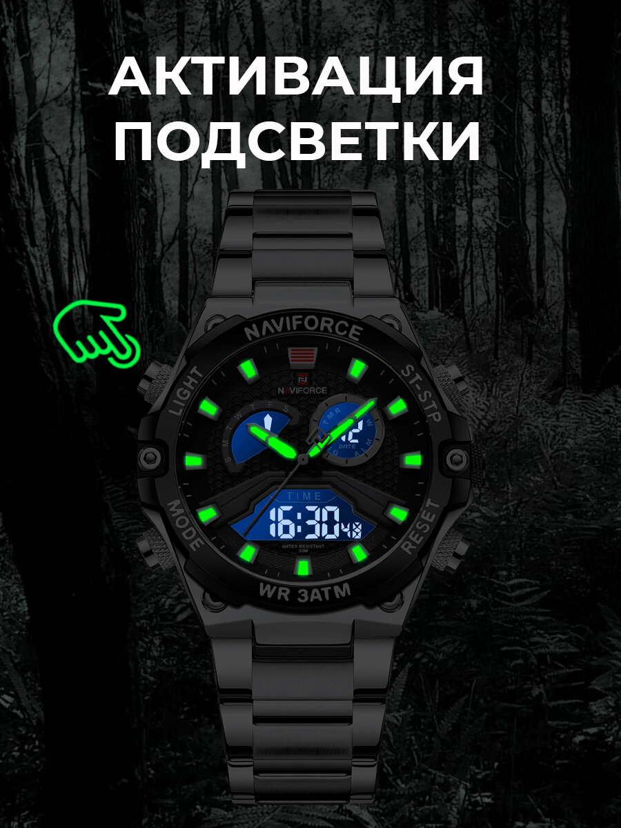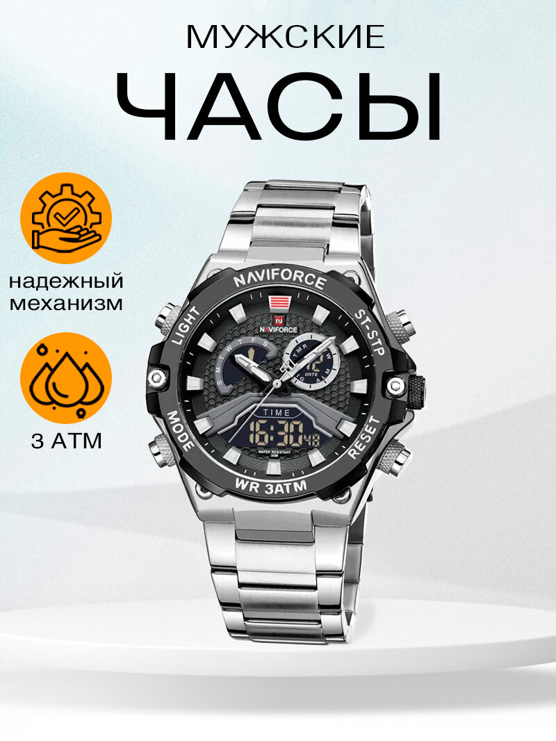Часы наручные мужские электронные кварцевые Naviforce металлические, с секундомером и подсветкой, серебристые/черные интересное: