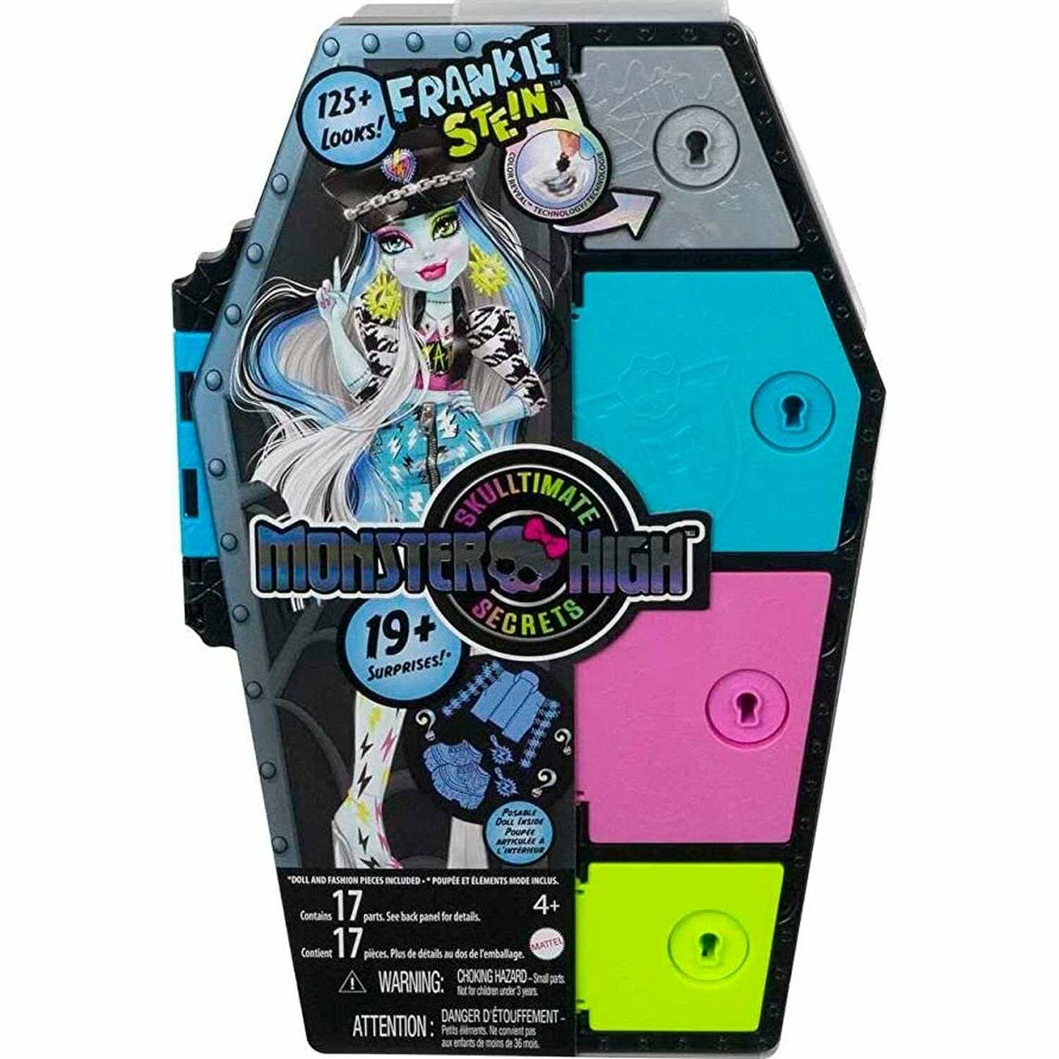 | Комплектация | 1 шкафчик для хранения вещей, 1 кукла Фрэнки Штайн, 4 ключа Color Reveal, а также разнообразная одежда и аксессуары |