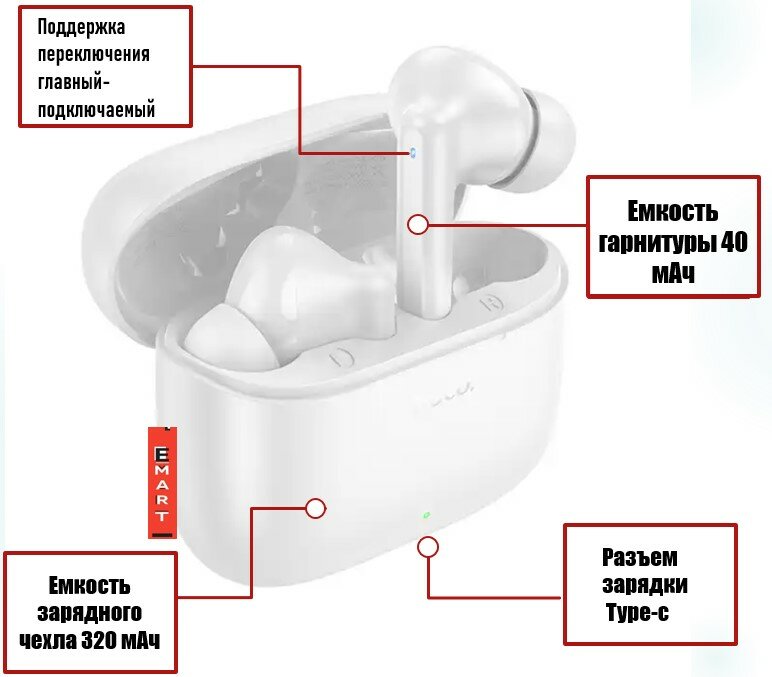 | Дополнительная информация | Емкость аккумулятора: чехол для зарядки 320 мАч; гарнитура 40 мАч. Время работы в режиме использования 7 часов, в режиме ожидания 180 часов. Выполнены в трех цветах. |