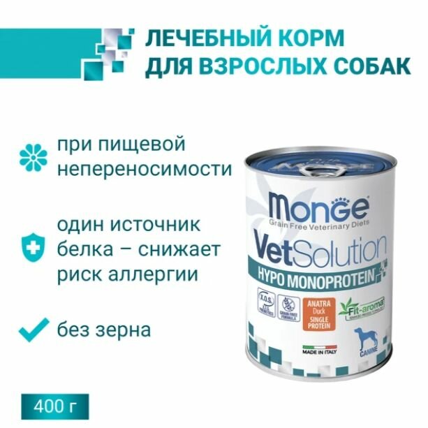 Купить Корм влажный для собак Monge VetSolution Dog Hypo Monoprotein DUCK, ветеринарная диета, гипо монопротеин с уткой, для снижения реакции пищевой непереносимости, консервы 12 ш x 400г