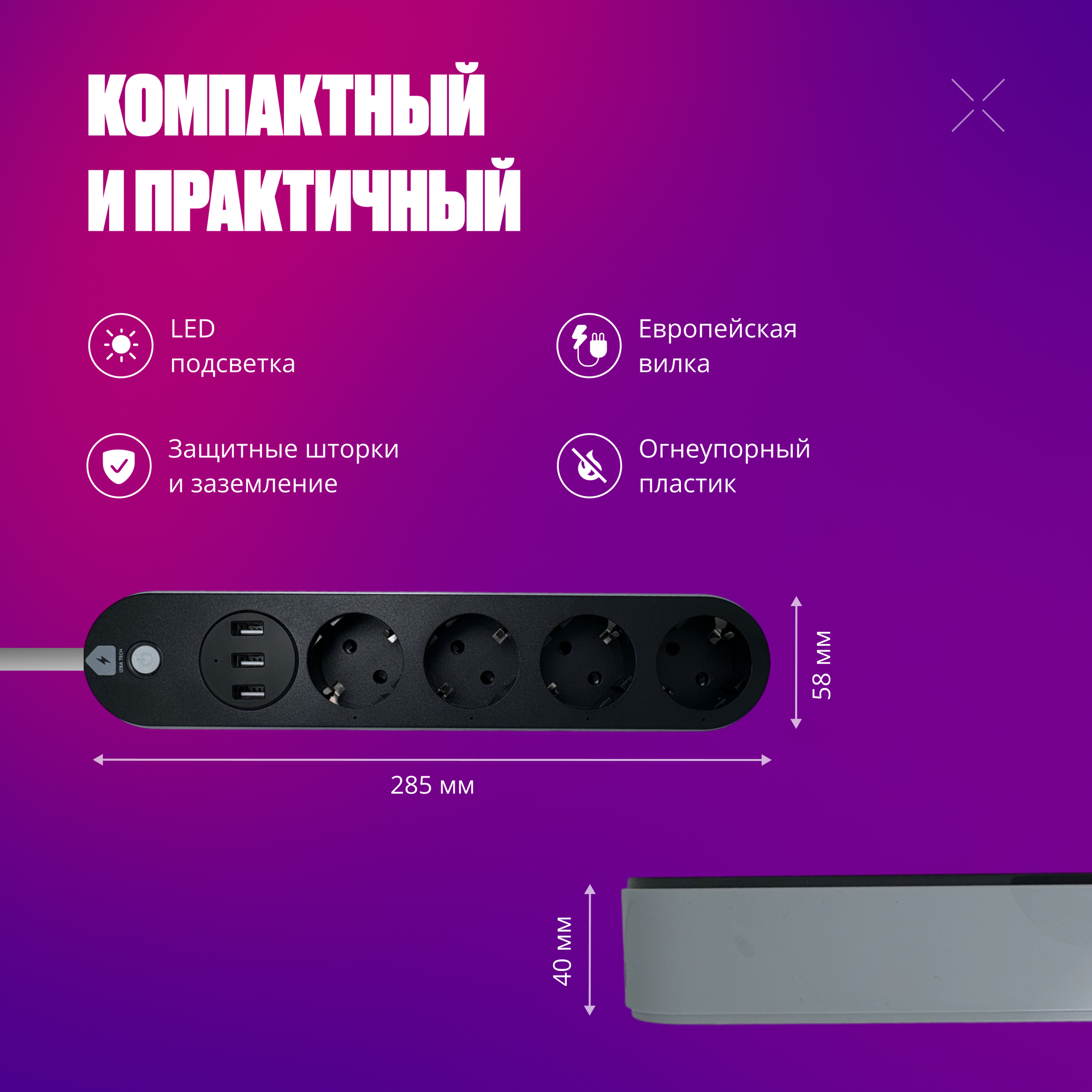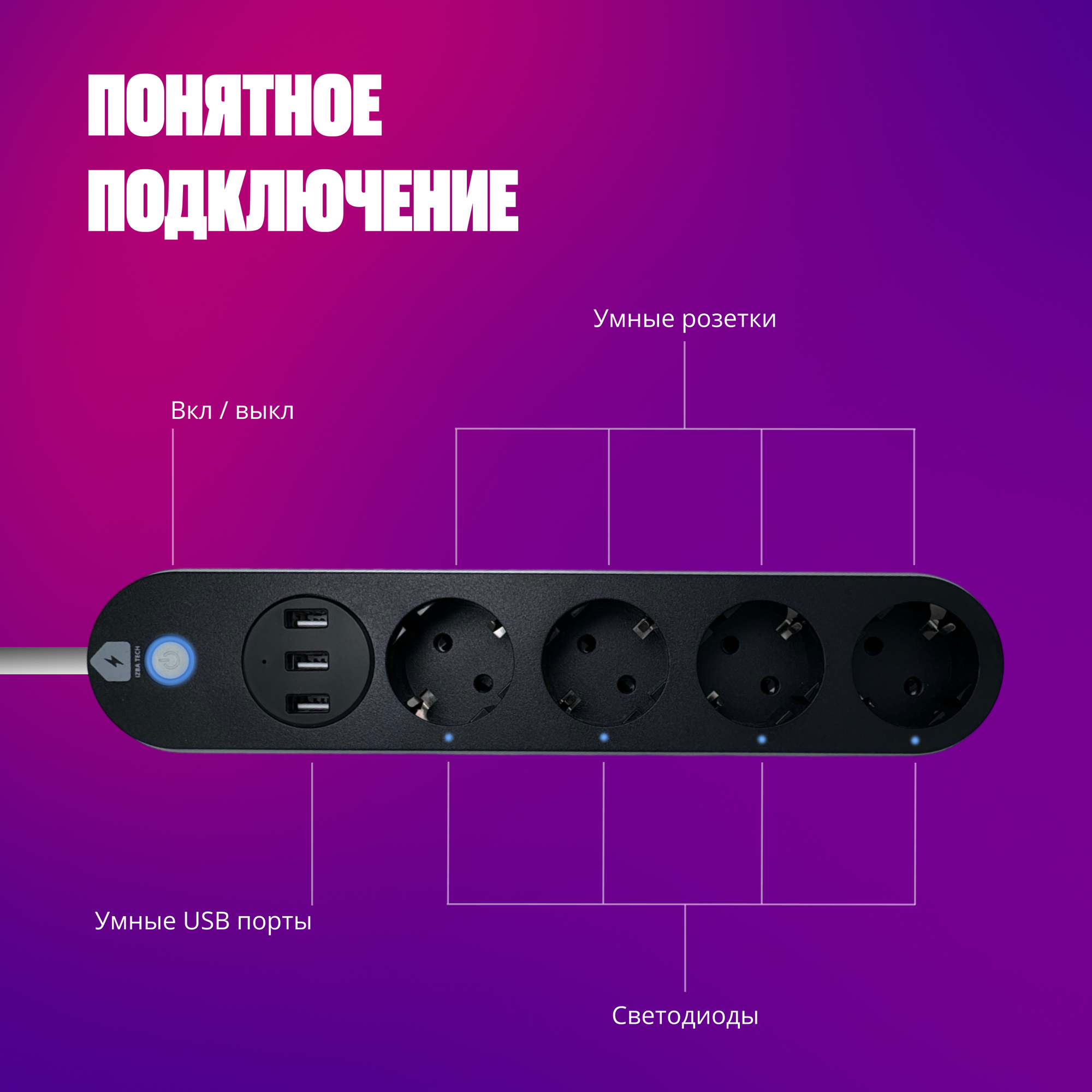 Умный сетевой фильтр, удлинитель с USB и WIFI для умного дома, 4 розетки + 3 USB, с заземлением, черный