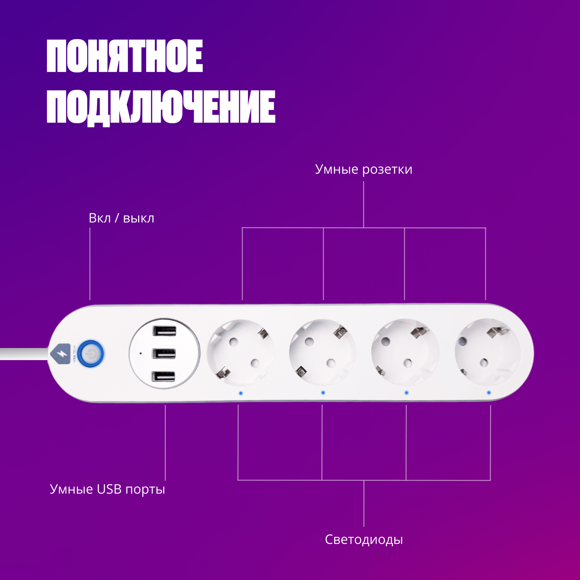 Умный сетевой фильтр, удлинитель с USB и WIFI для умного дома, 4 розетки + 3 USB, с заземлением, белый