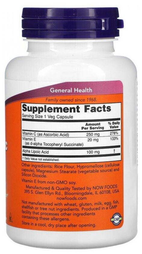 NOW Foods Alpha Lipoic Acid 100 мг vitamin C and E 60 капсул