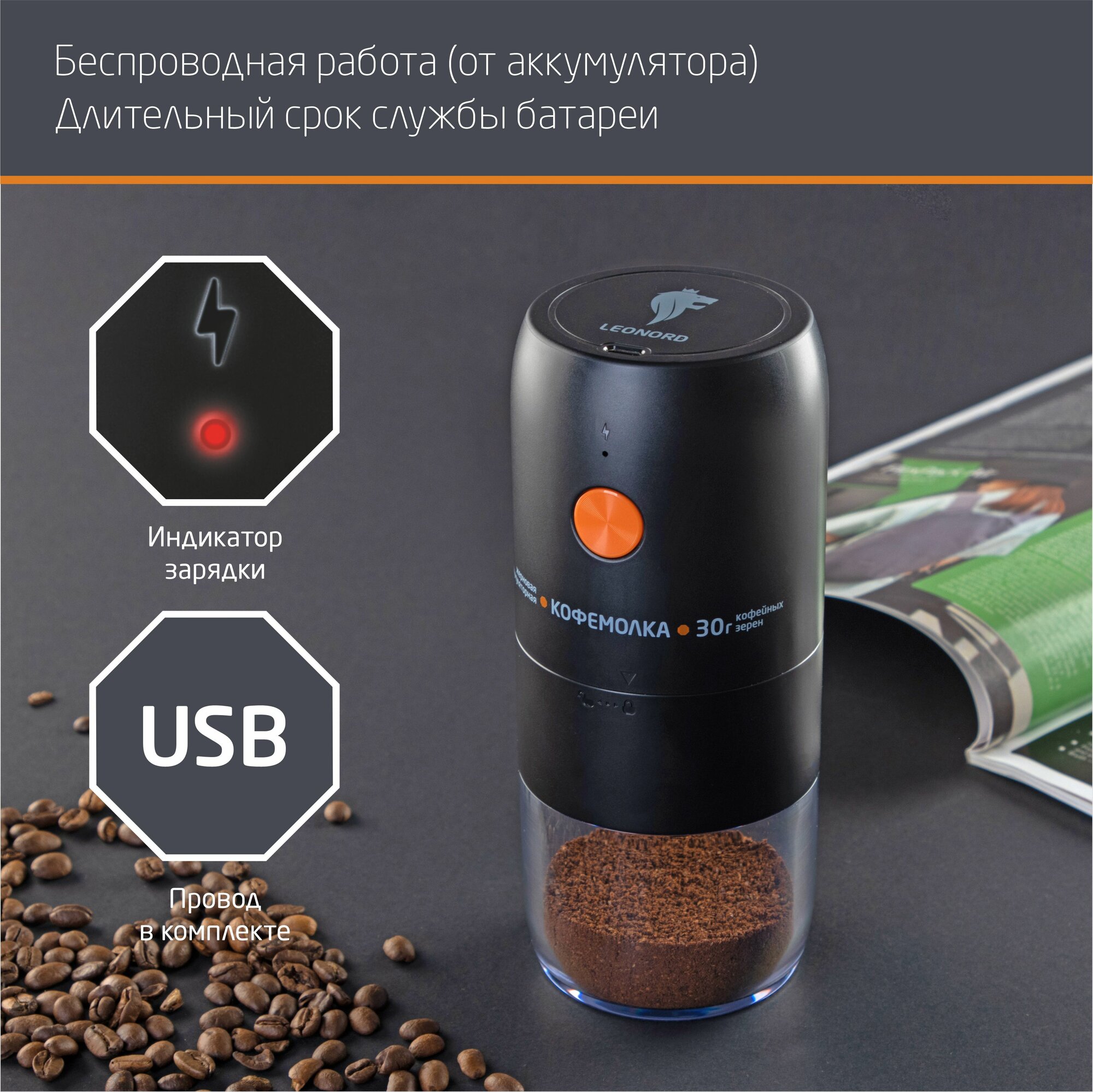 Кофемолка аккумуляторная Leonord LE-1734, 25 Вт, черная