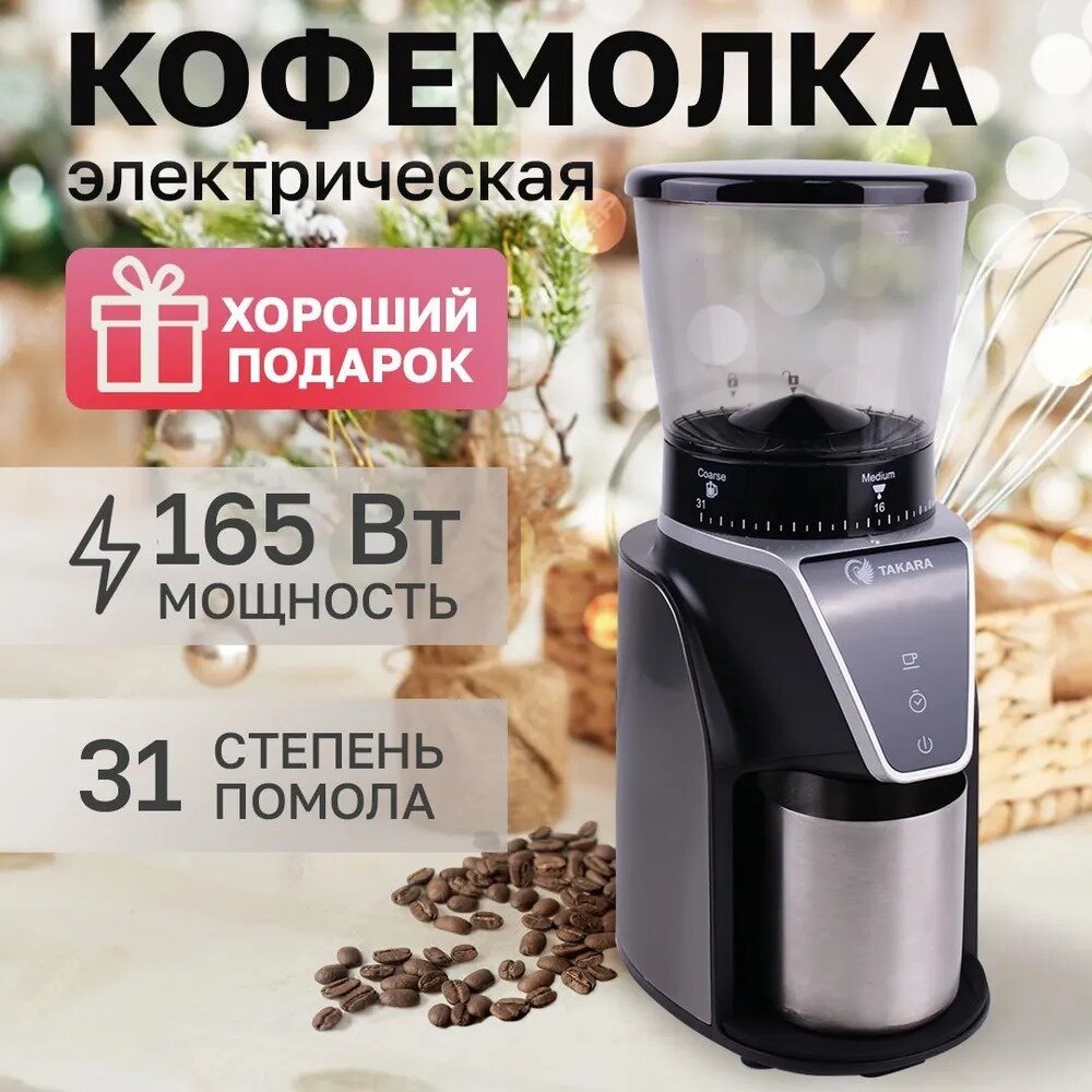 Коническая кофемолка TAKARA CG-001, жерновая, регулировка помола, объем 275г, черная интересное: