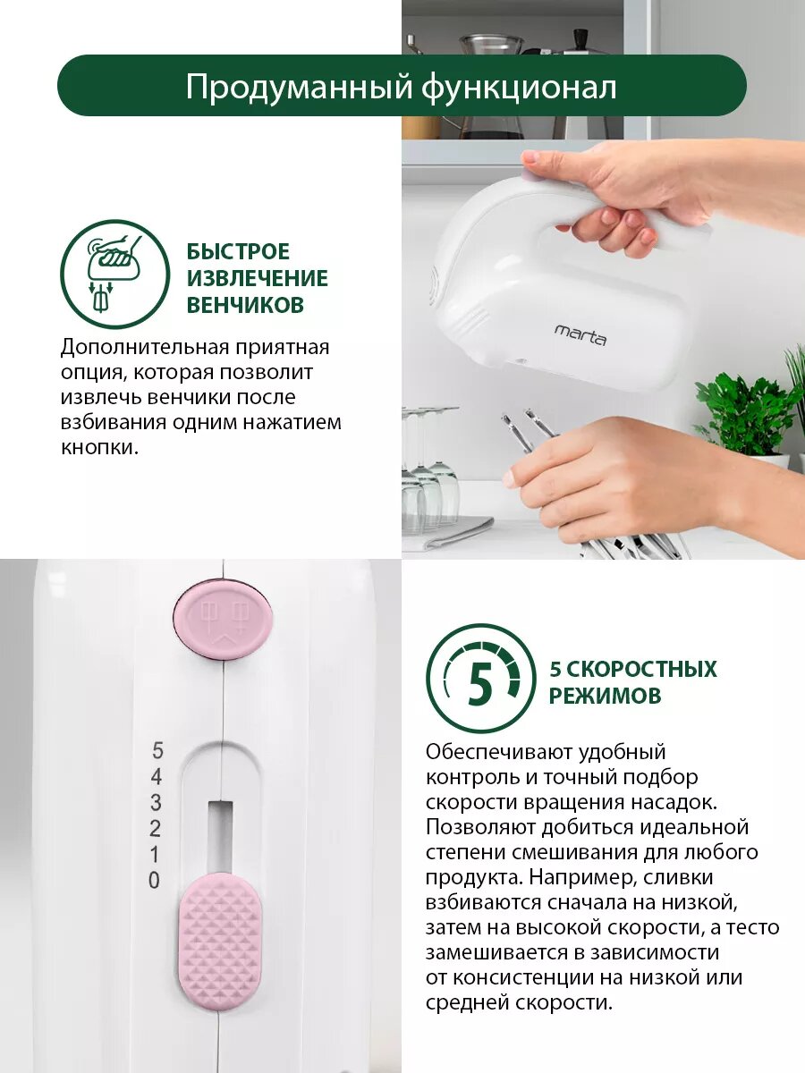 Миксер MARTA MT-MX1516A, 800Вт, 5 скоростей, кнопка отсоединения насадок