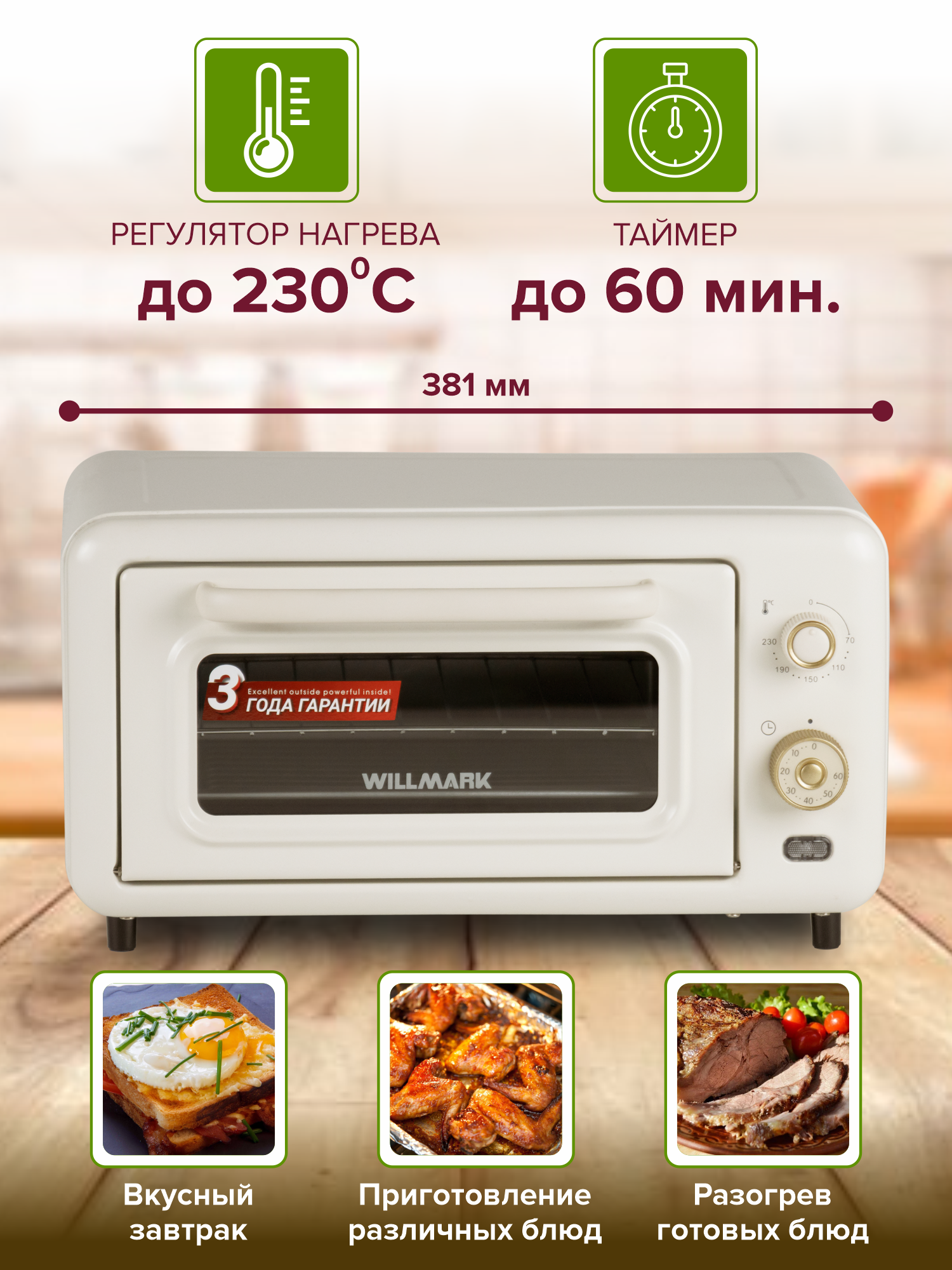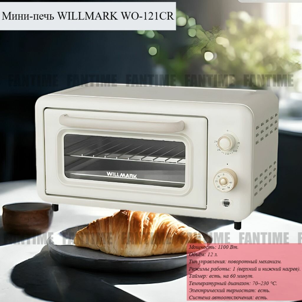 Мини-печь WILLMARK WO-121CR (12л, 1100Вт, противень, решетка, таймер, кремовый ретро) интересное: