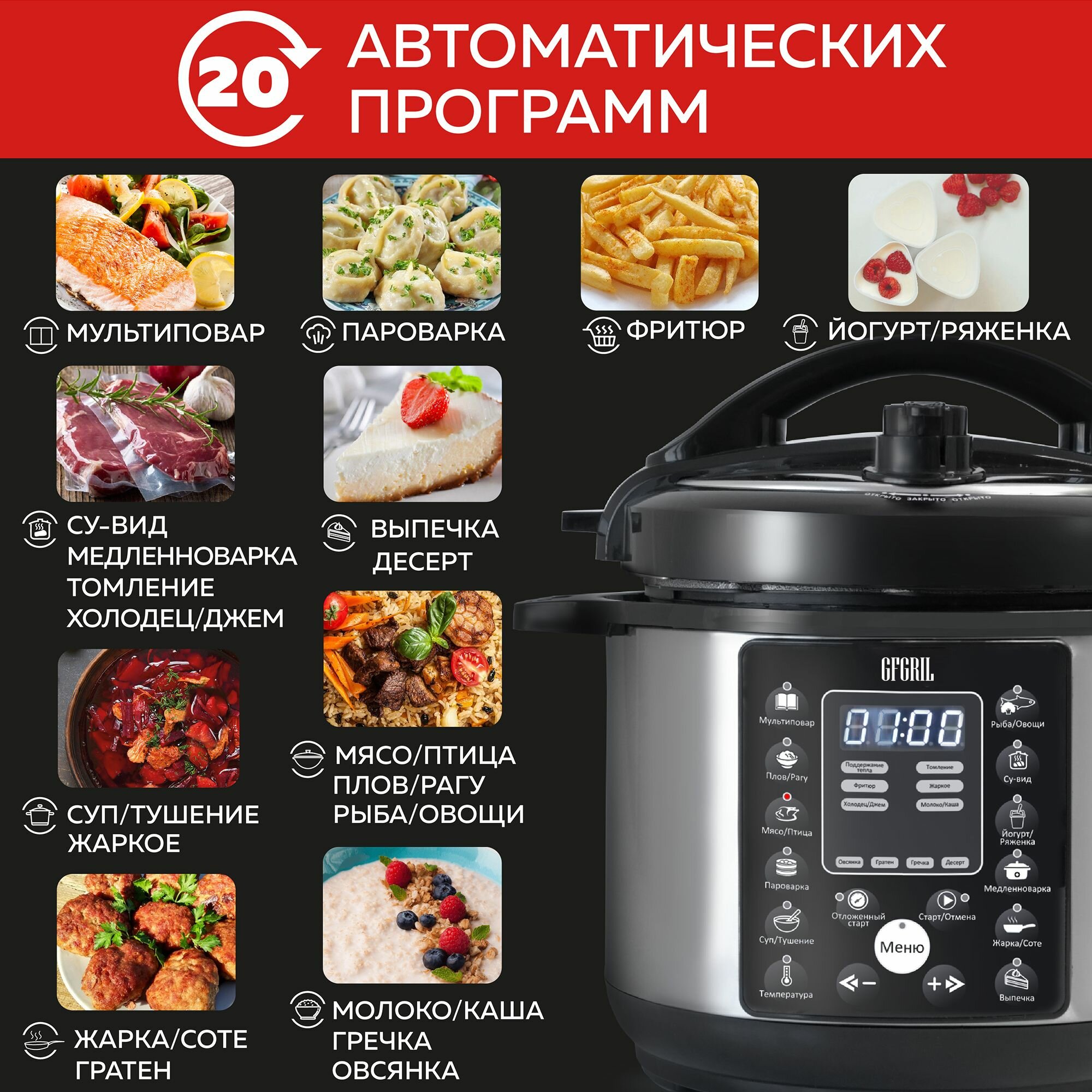 Мультиварка-скороварка 6 в 1 GFGRIL GFM-500, 20 автоматических программ интересное: