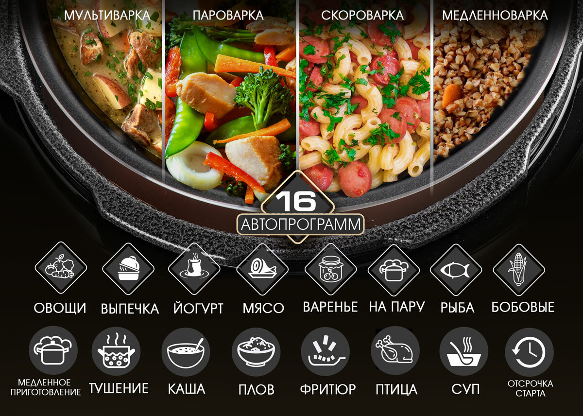 | Программы приготовления | варенье / выпечка / жарка / йогурт / молочная каша / паста / плов / приготовление на пару / суп / тушение / фритюр |