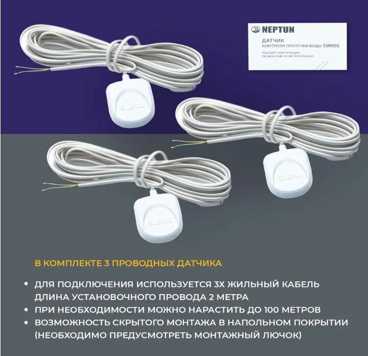 | Подробная комплектация | Модуль управления Neptun Base - 1 шт., Датчик Neptun SW005 - 3 шт., Кран шаровый с электроприводом Neptun PROFI 1/2 220В - 2 шт. |