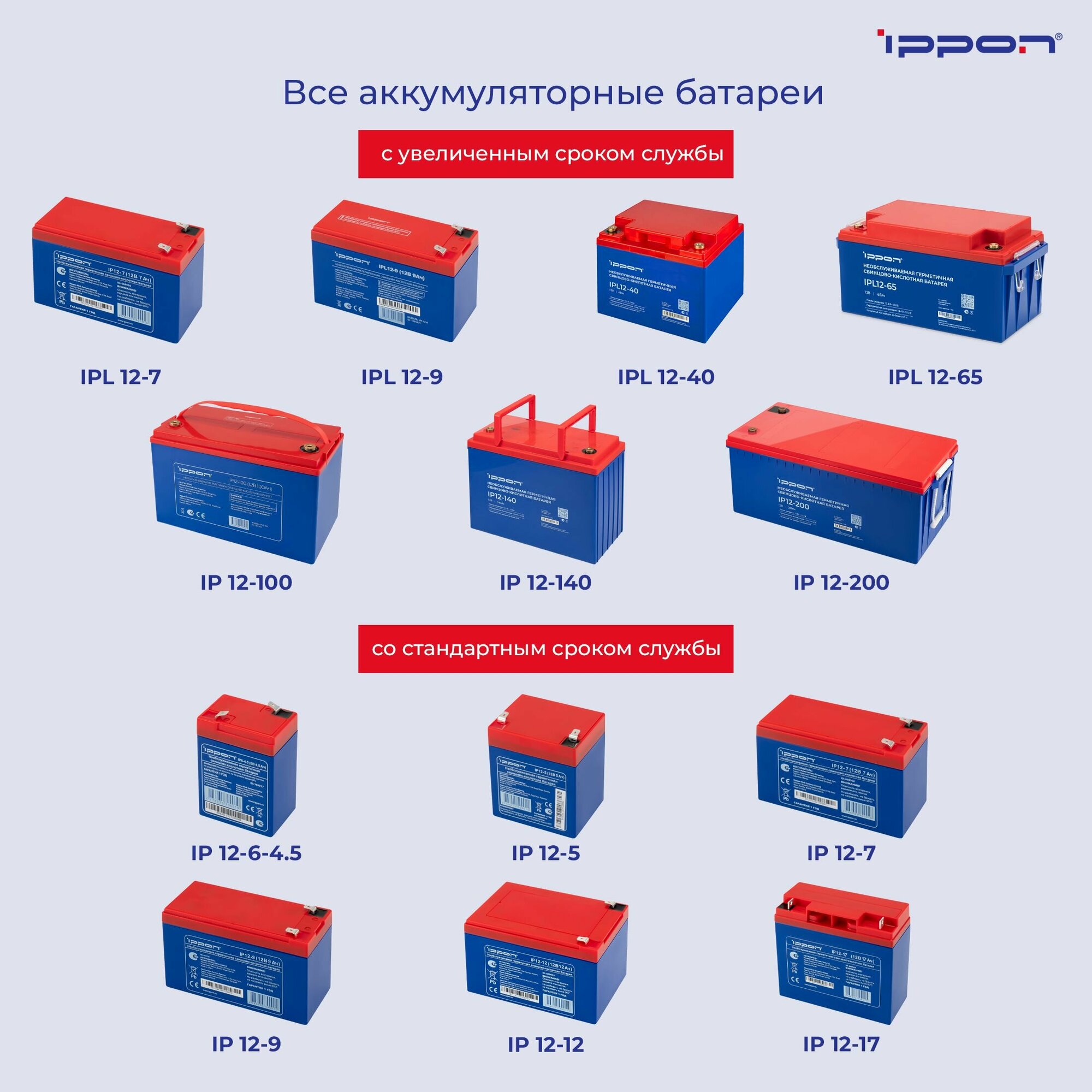 | Дополнительная информация | ,атареи IPPON разрешается хранить без подзарядки не более 6 месяцев при температуре 25°C (77°F)При повышении температуры срок хранения без подзарядки уменьшается |
