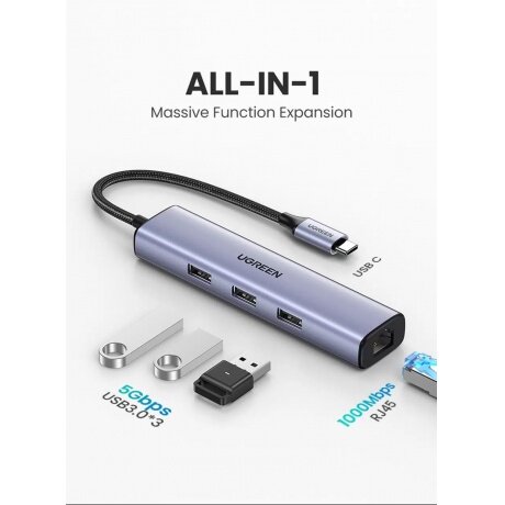 Порт-репликатор UGREEN CM475 USB-C to 3×USB3.0 Hub+RJ45 (1000M) Ethernet Adapter без порта питания, серый