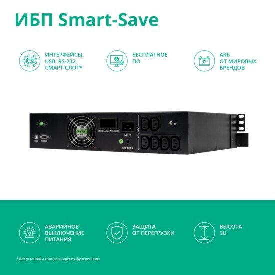 ИБП Systeme Electric Smart-Save SMT 2000 ВА, монтаж в стойку 2U, 230 В, 6 розеток IEC C13, SmartSlot, AVR, LCD, USB HID