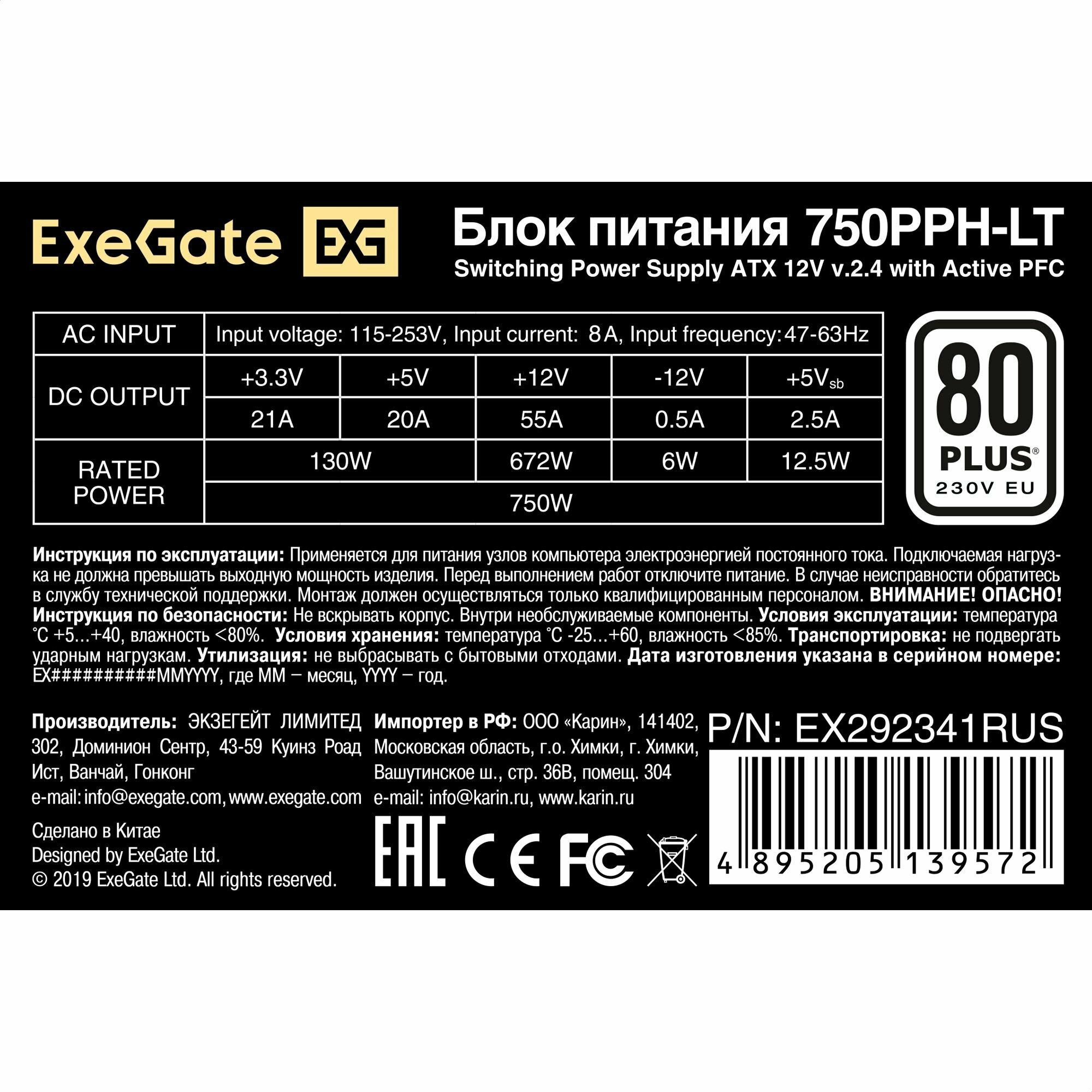 Блок питания 750W ExeGate 80 PLUS® 750PPH-LT-OEM (ATX, APFC, КПД 82% (80 PLUS), 12cm fan, 24pin, 2x(4+4)pin, 4xPCI-E, 8xSATA, 4xIDE, black, RTL) EX292341RUS-OEM