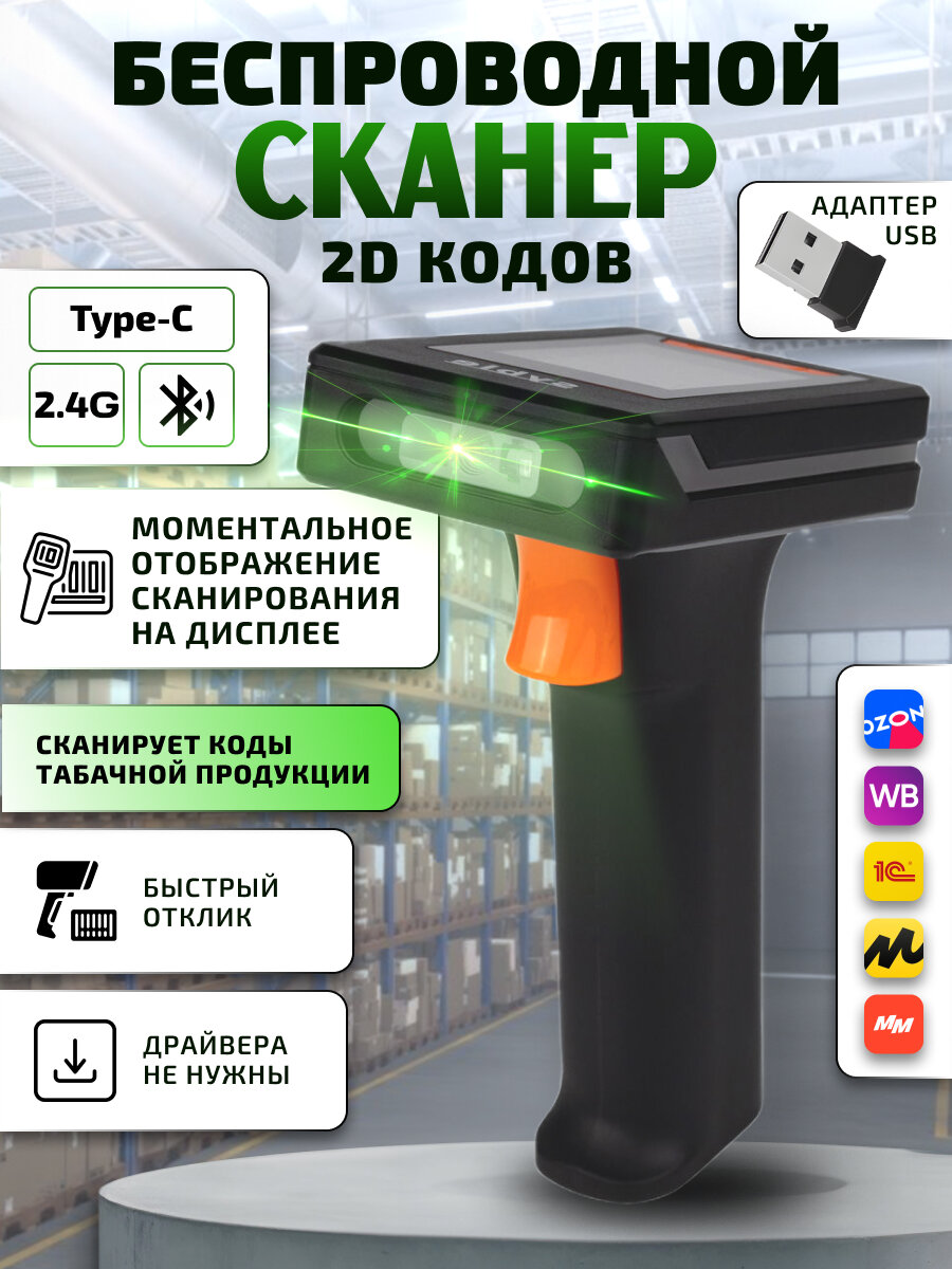 Беспроводной сканер штрих-кодов F19W 2D для пвз, маркировки, ЕГАИС, Честный знак, QR, 1C, Frontol, Атол, Меркурий и др