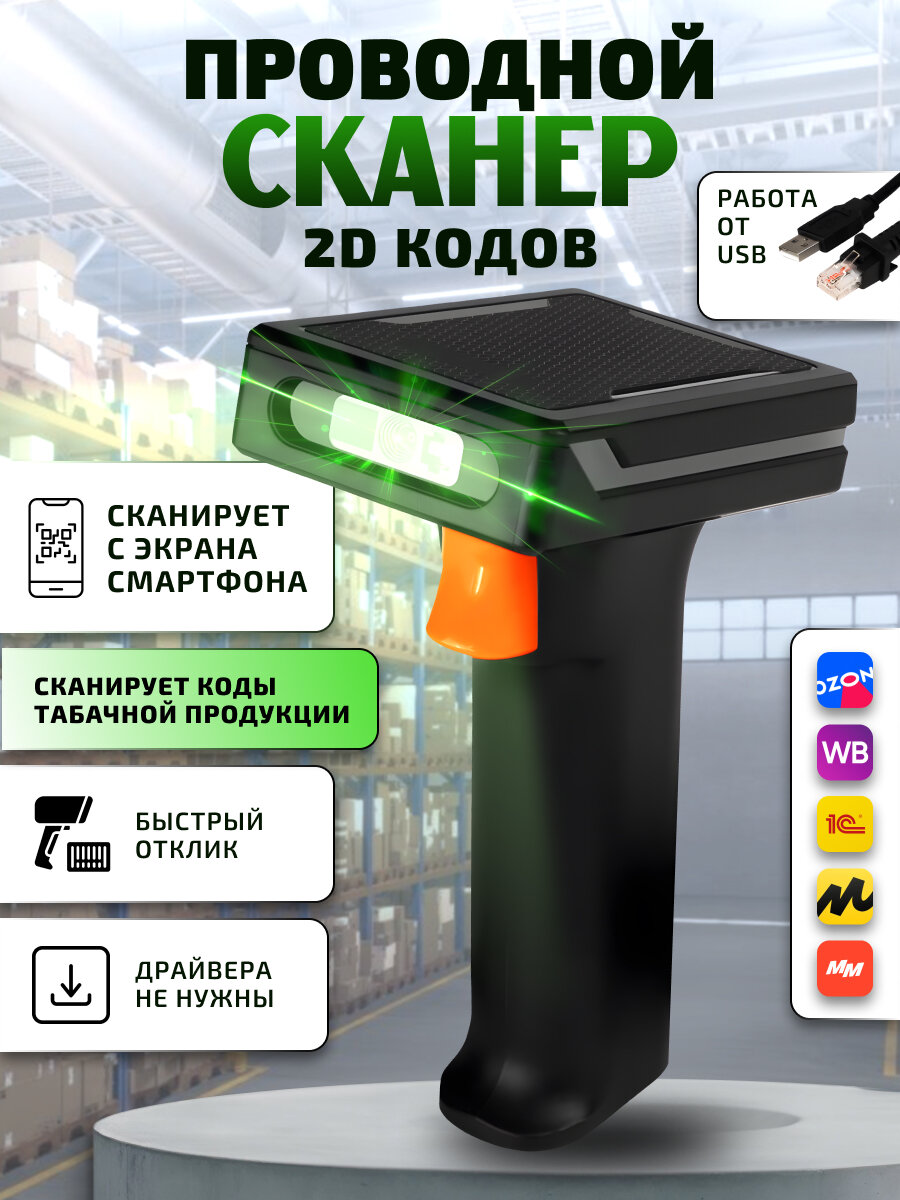 Сканер штрих-кодов 2D USB проводной для маркировки, ЕГАИС, Честный знак, QR, 1C, Frontol, Атол, Меркурий, Эвотор и др