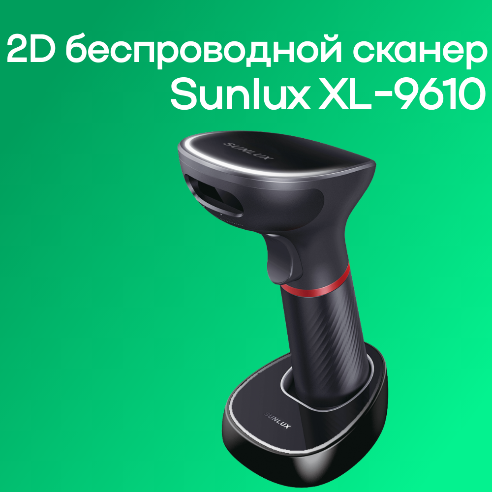 | Комплектация | Беспроводной сканер штрих-кода SUNLUX XL-9610, арт. XL-9610, 2D, черный, беспроводной, с подставкой Cradle |