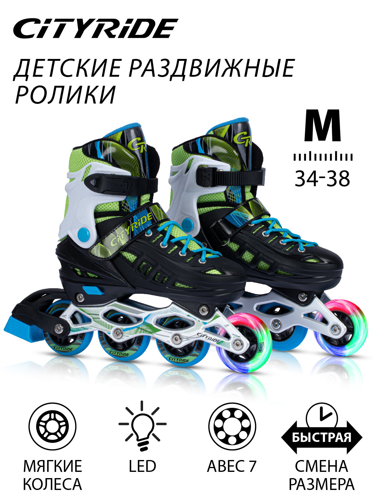 Роликовые коньки детские CITY-RIDE, PU колеса/первое светится, ABEC 7, размер M(34-38), раздвижные, JB8800095/M