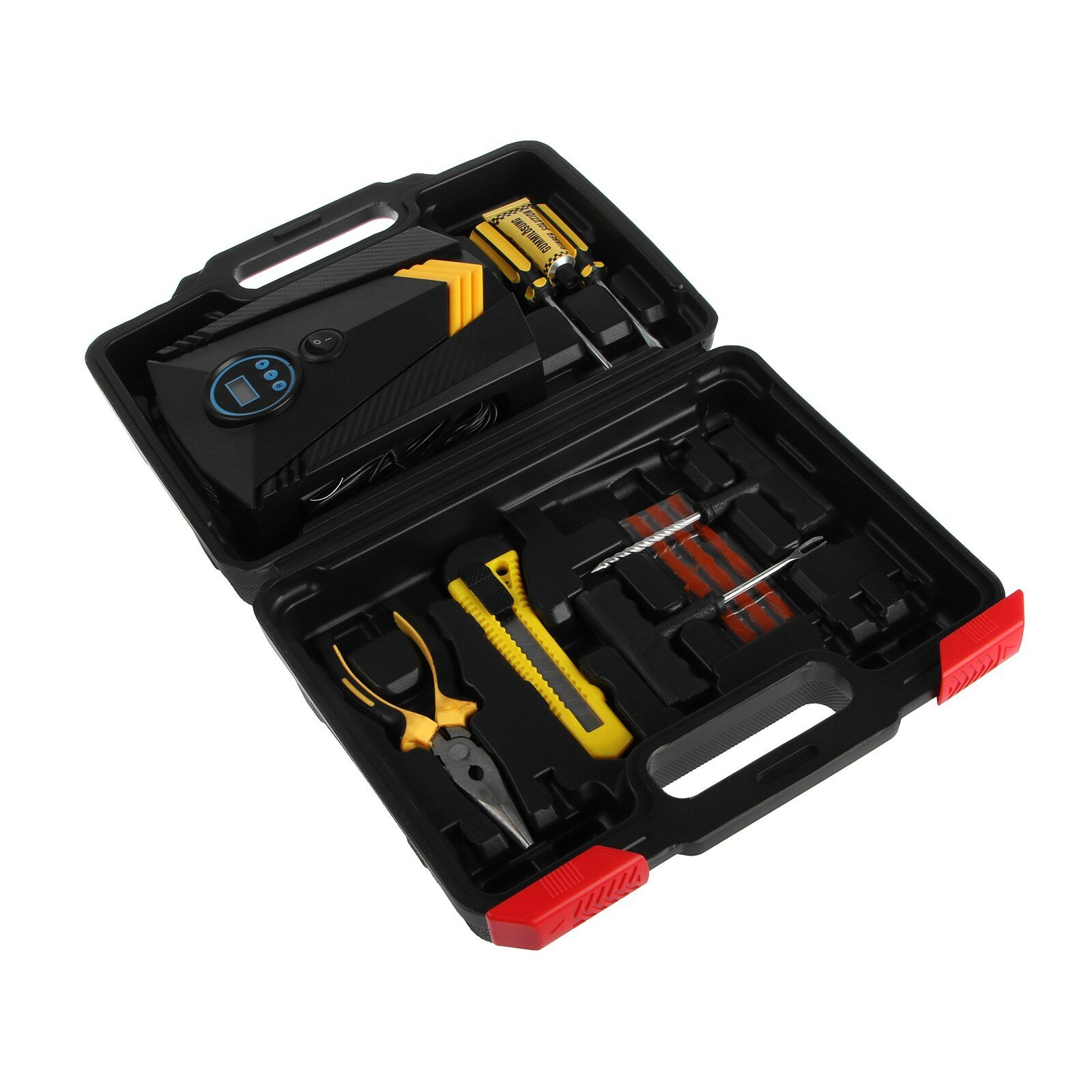 компрессор с фонарем и набором инструментов в кейсе